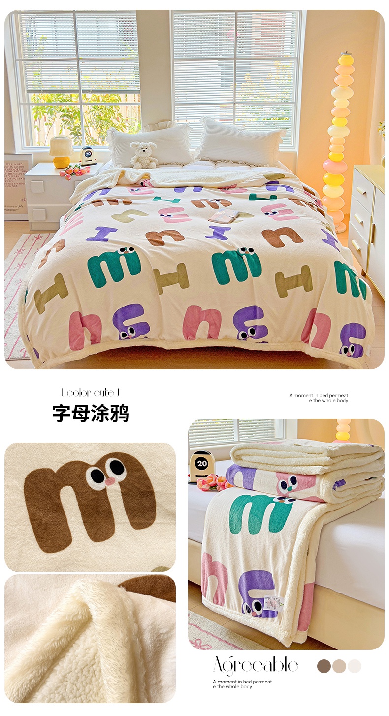 鑫喜莱家纺 2024新款牛奶绒羊羔绒盖毯毛毯毯子午睡毯 字母涂鸦