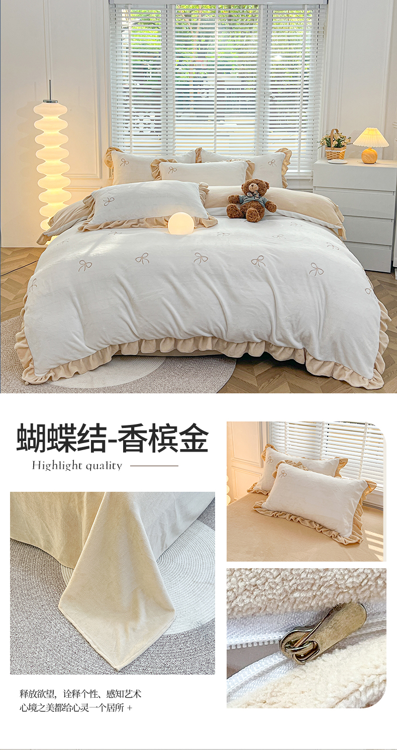 商品名称:金麦家纺 2024新款花边款牛奶绒四件套 蝴蝶结-香槟金