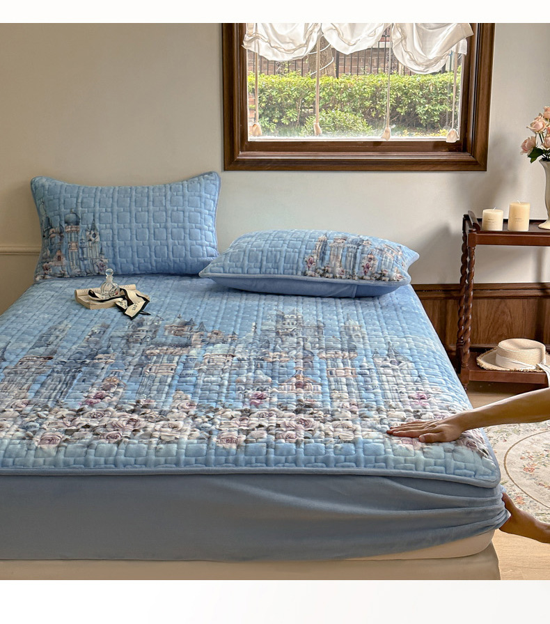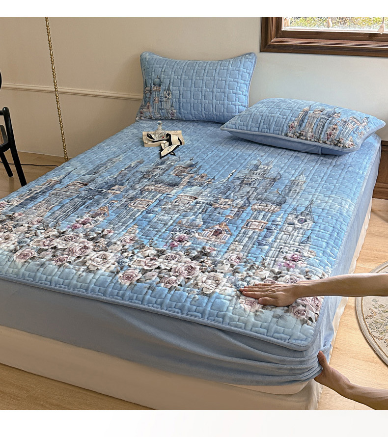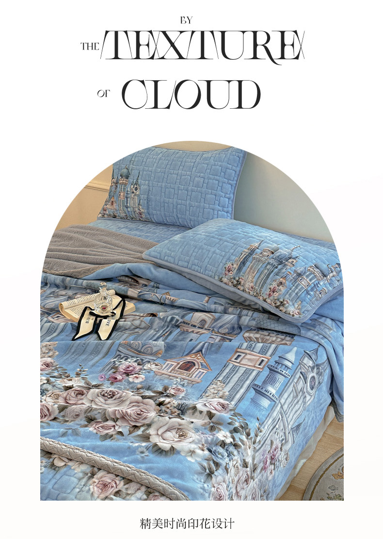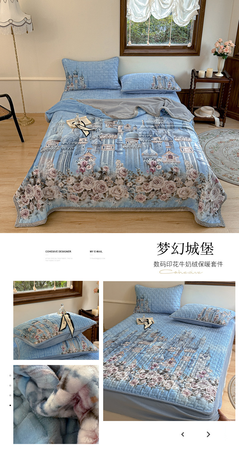 商品名称:麋兔 2024新款法式原创手绘牛奶绒床笠盖毯 梦幻城堡