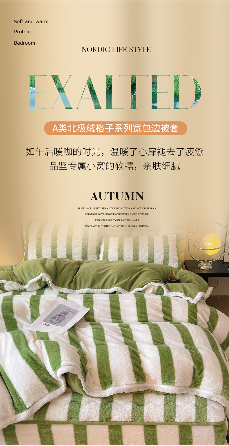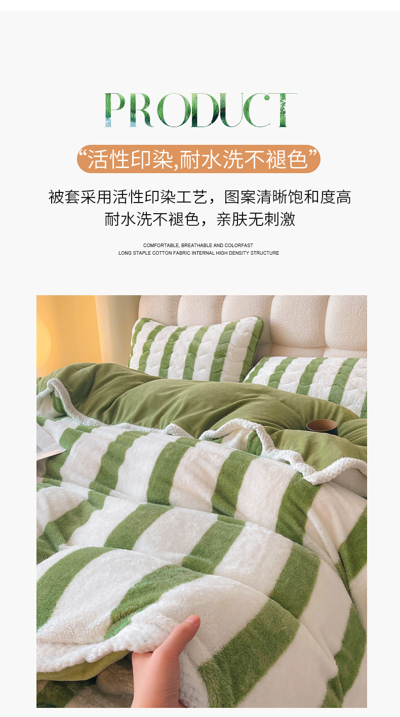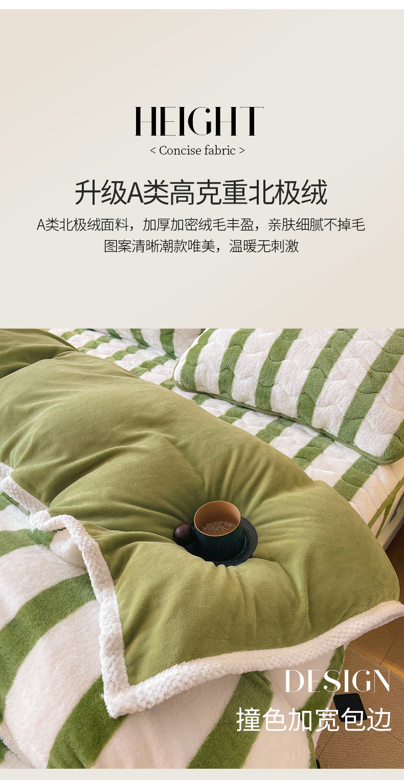 商品名称:2024新款A类北极绒格子-条纹系列宽包边加厚被套(暖光图) 条纹-豆绿
