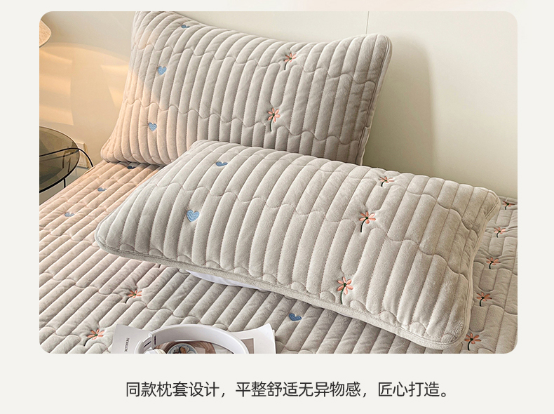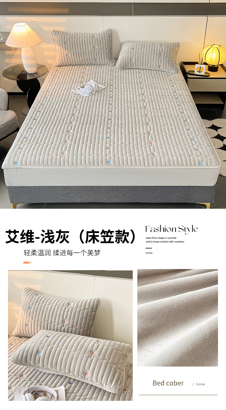 2024新款A类纯色牛奶绒刺绣薄款床垫加厚绒保暖床笠床护垫 艾维-浅灰(床笠款)