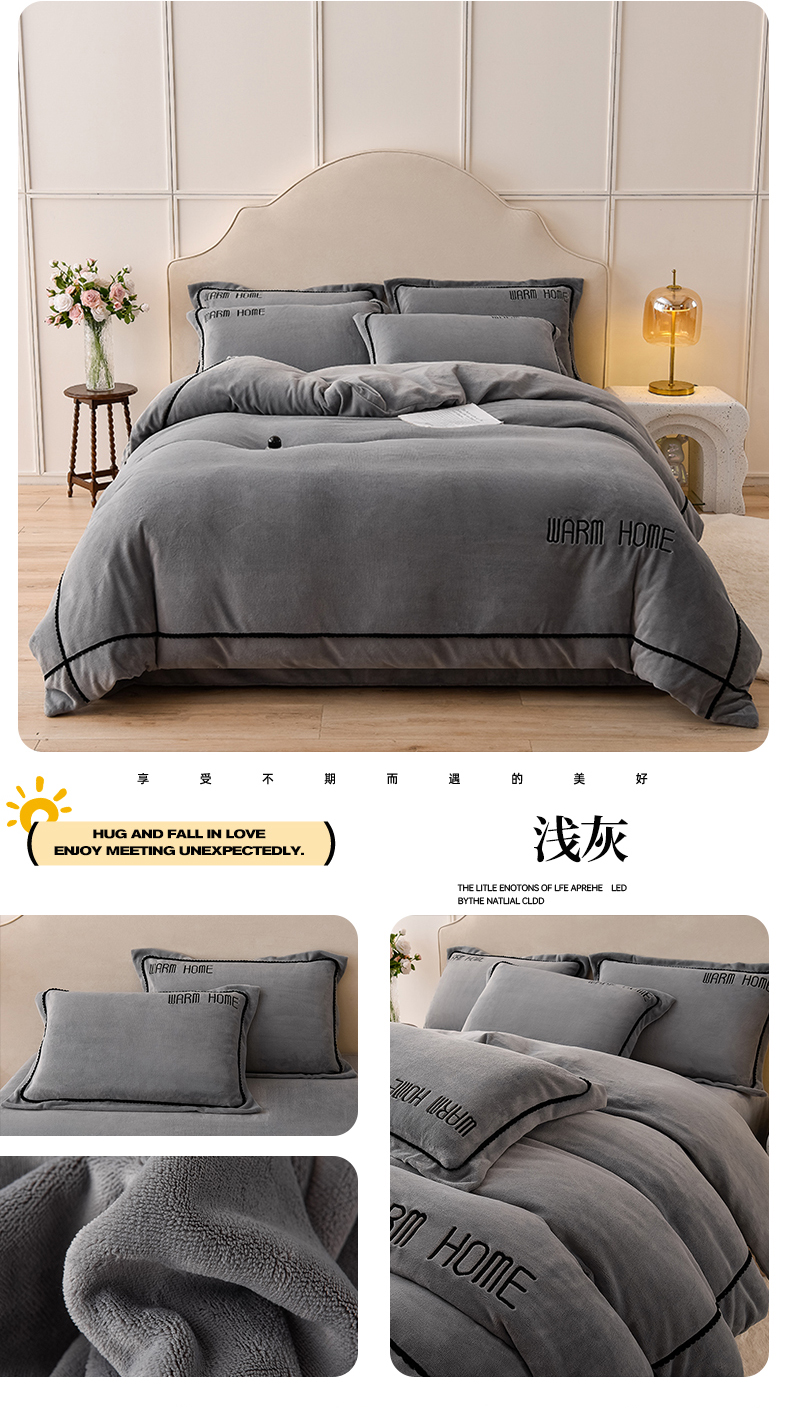 商品名称:同田家纺 2024新款230克蓄暖高克重牛奶绒四件套 浅灰