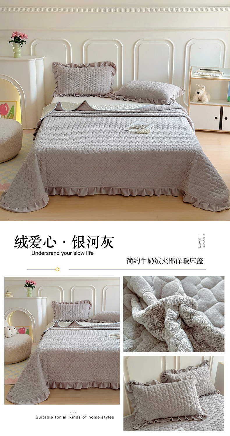 • 91家纺网 家纺一手货源 找家纺 美梦家纺 2024新款素色牛奶绒花边床盖系列 银河灰