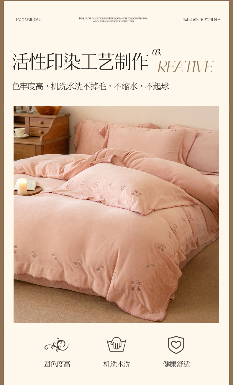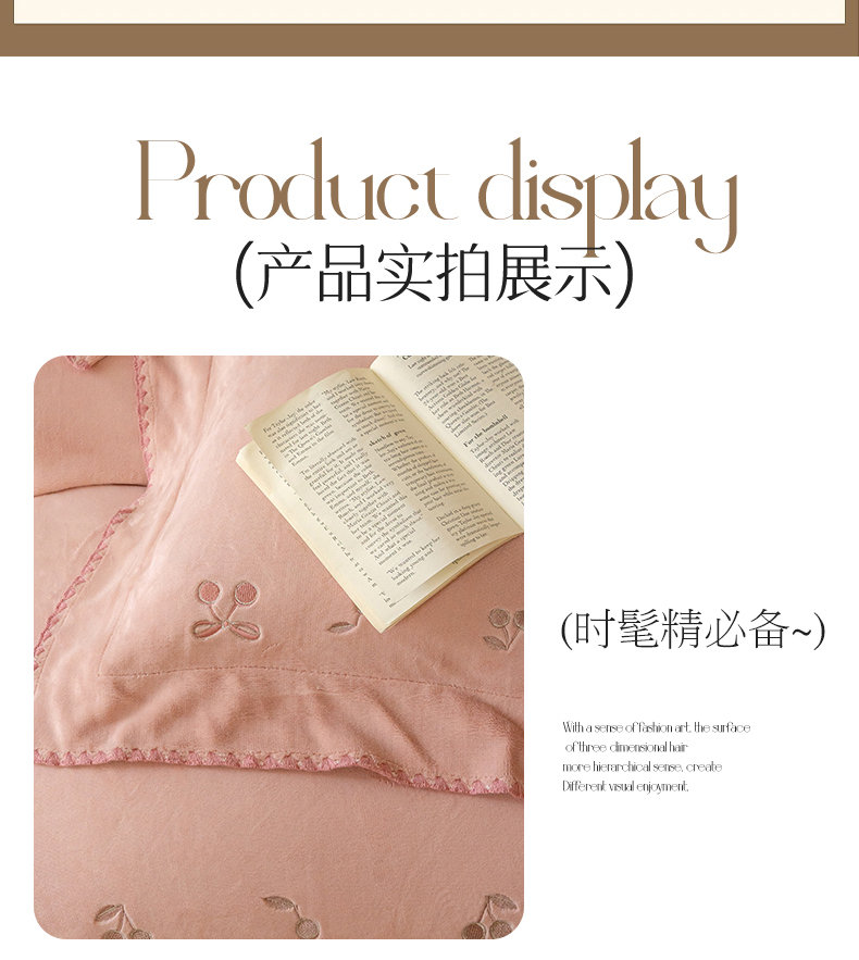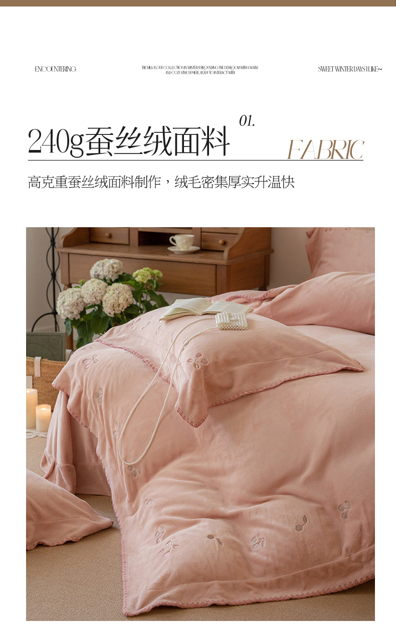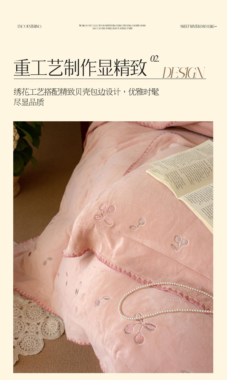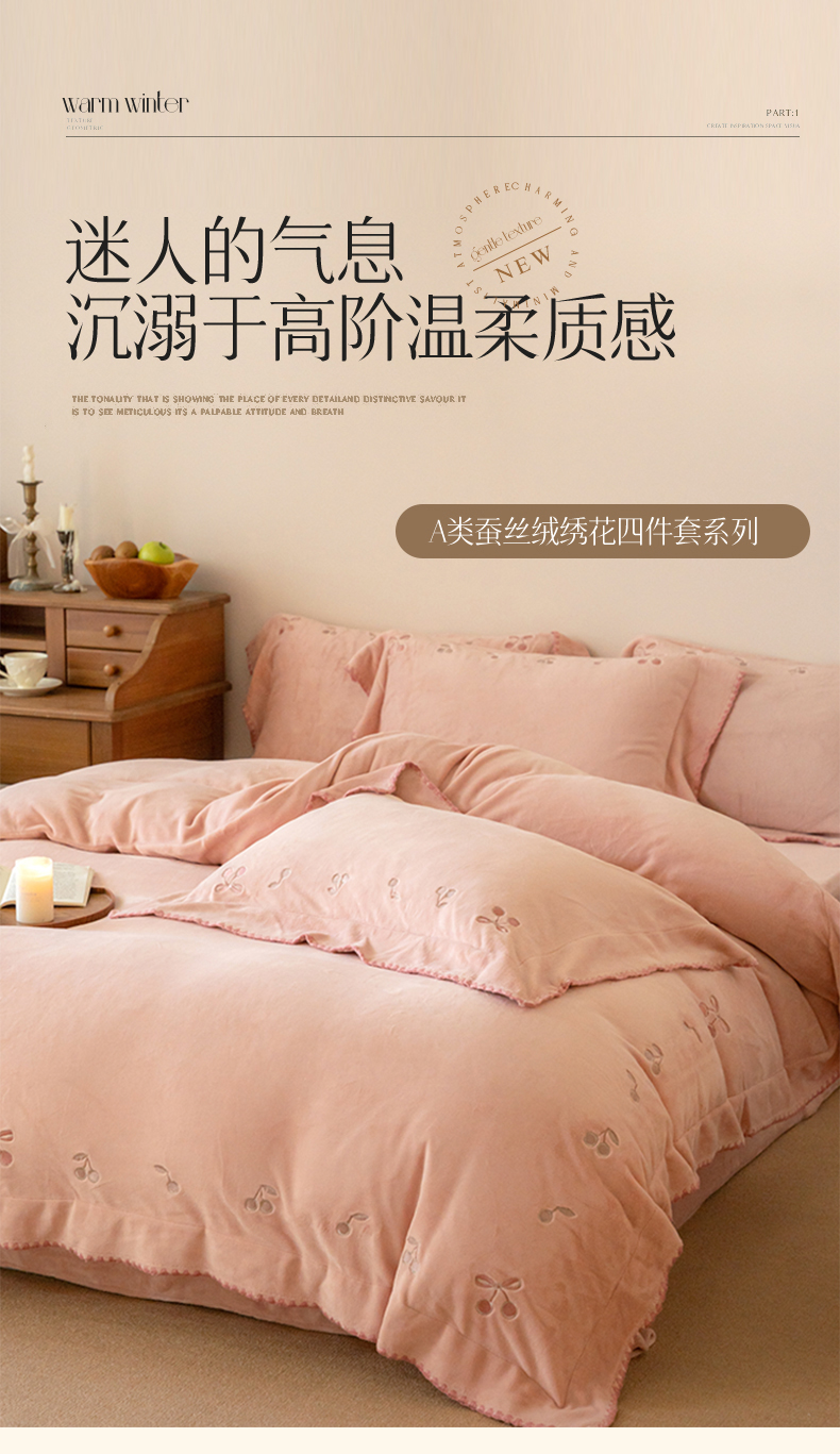 商品名称:名品优仓 2024新款高克重牛奶绒绣花四件套-樱桃之玥 樱桃之玥-梦豆沙