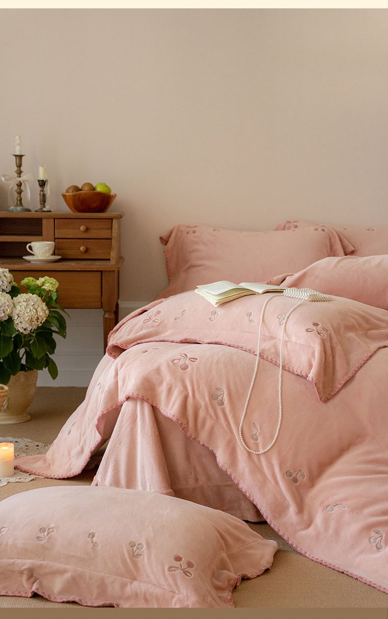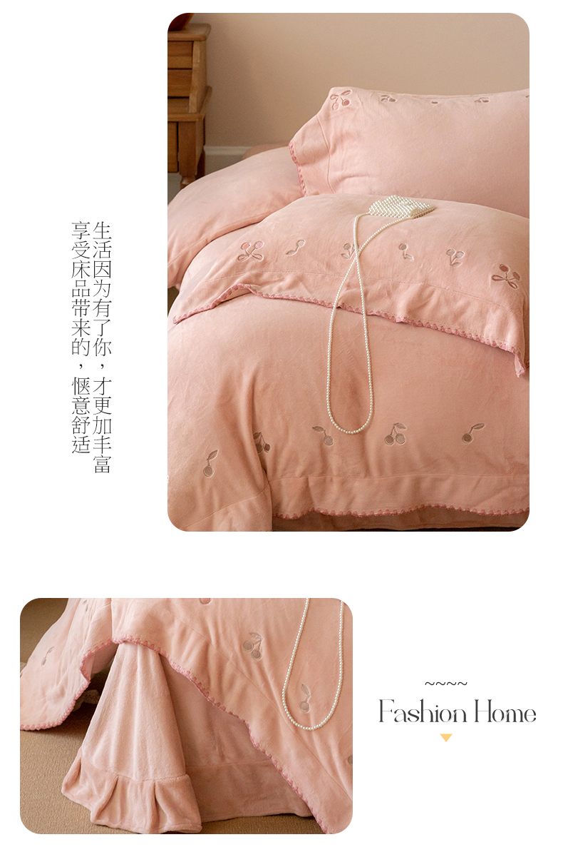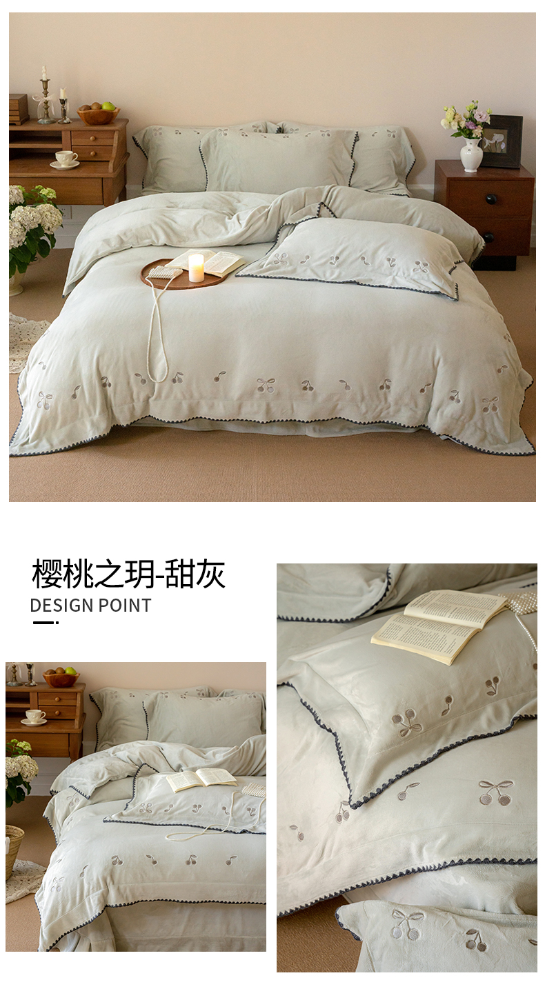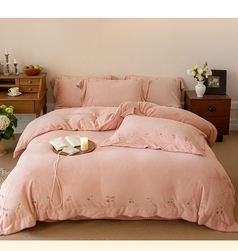 名品优仓 2024新款高克重牛奶绒绣花四件套-樱桃之玥 樱桃之玥-梦豆沙