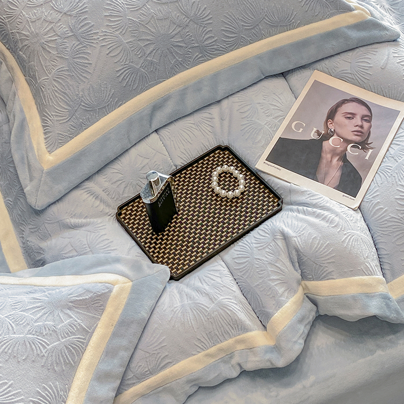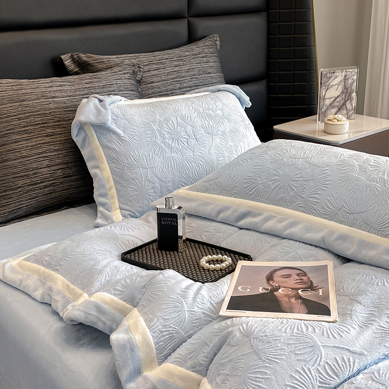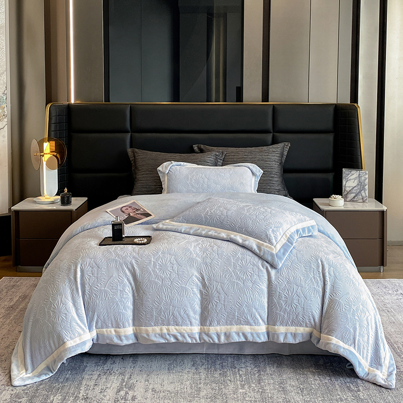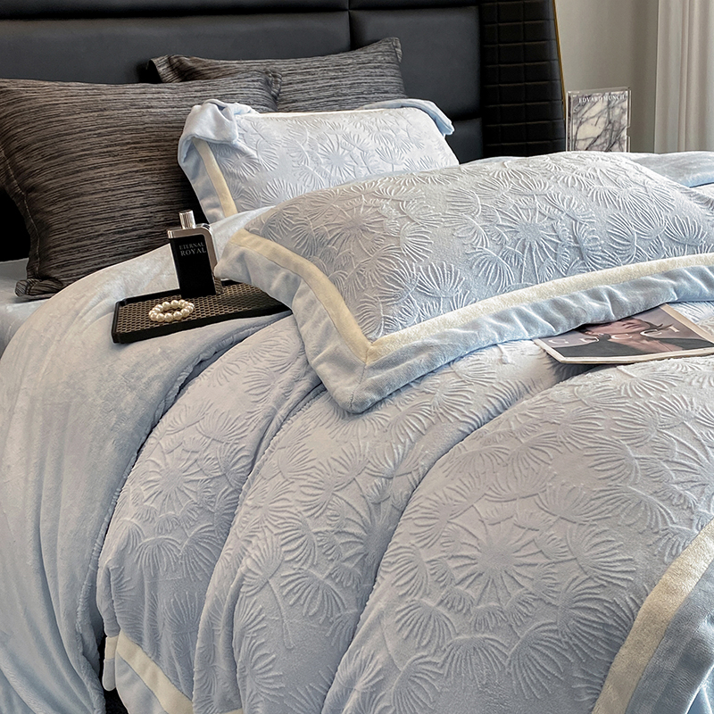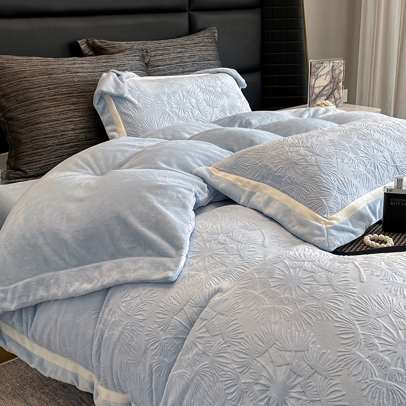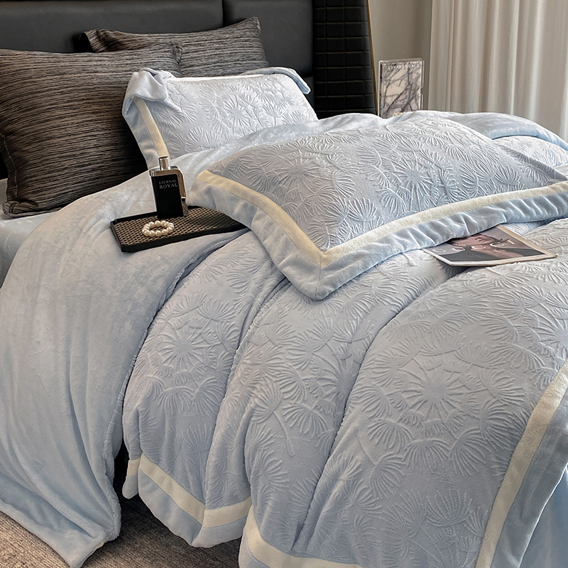 商品名称:2025新款秋冬AB版250克全消光立体雕花烂花牛奶绒双拼角四件套-璀璨烟花 璀璨烟花-浅天蓝