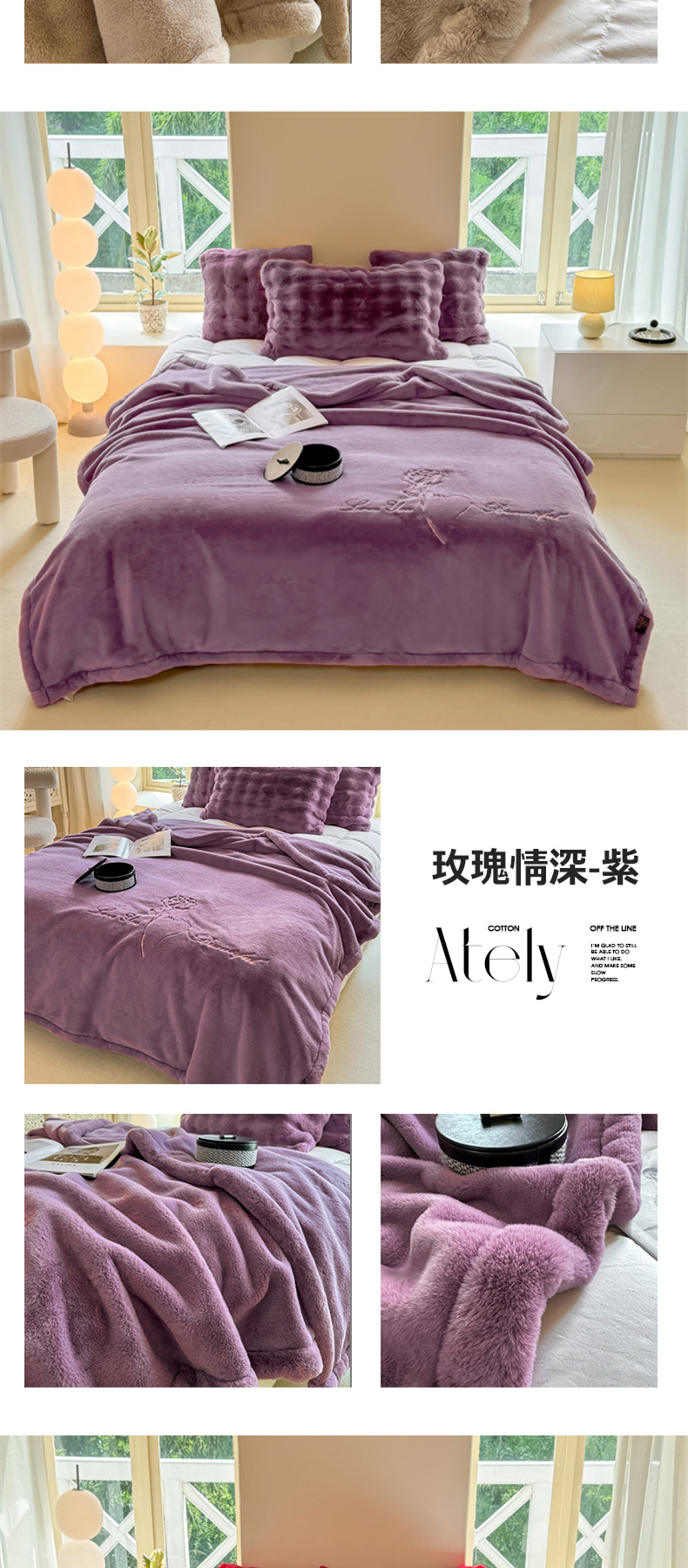 商品名称:悦织湾家纺 2025新款轻奢仿兔毛绒仿裘皮仿皮草绣花毛毯 玫瑰情深-紫