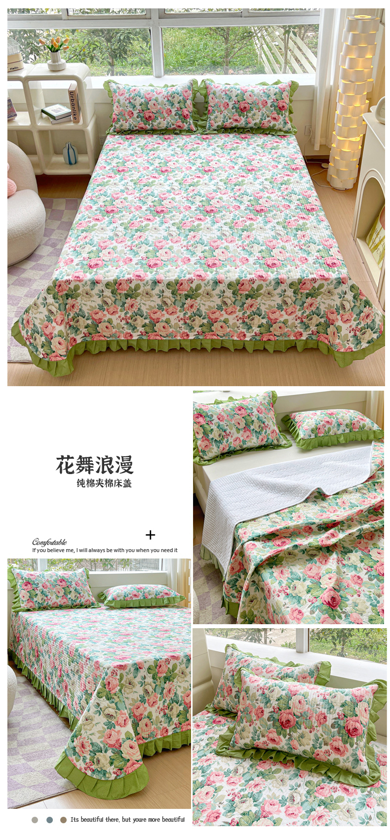 2024新款13372全棉斜纹夹棉绗缝纯棉花边床盖 花舞浪漫