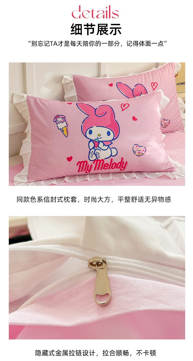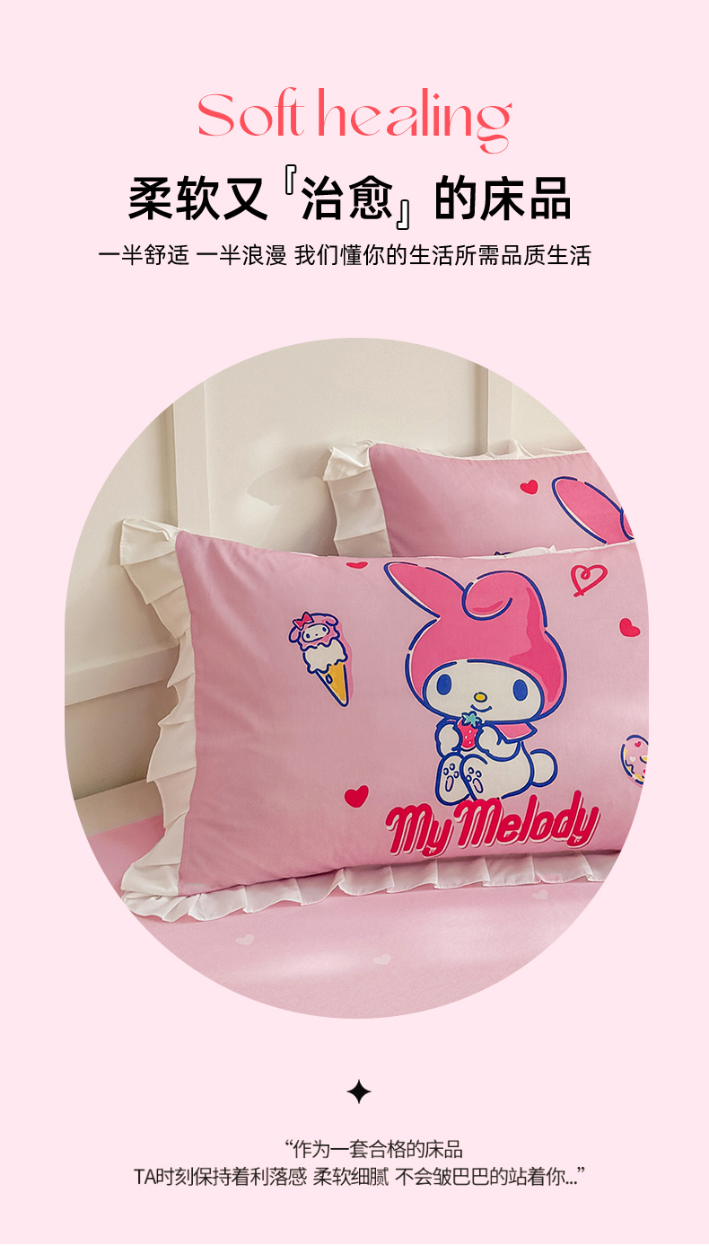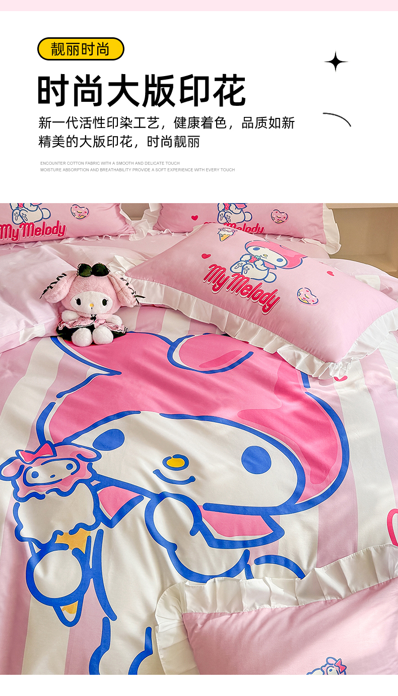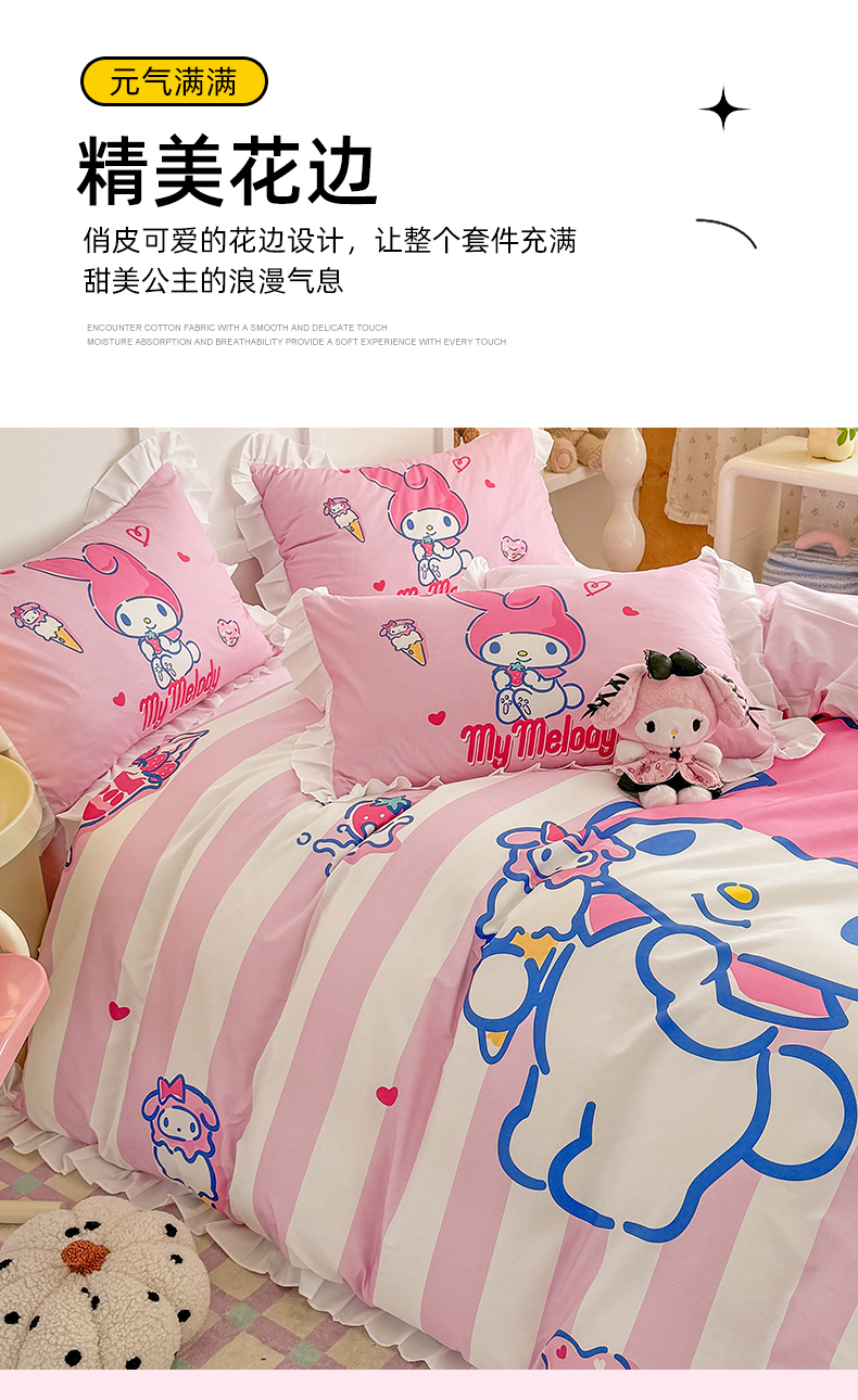 当前位置: 91家纺网 > 商品网购 > 床品套件 > 四件套 > 全棉普通四件套 > 玉元坊 2025年新款三丽鸥系列数码印花纯棉全棉床裙三件套四件套-花边款式 大版花边-甜筒美乐蒂
