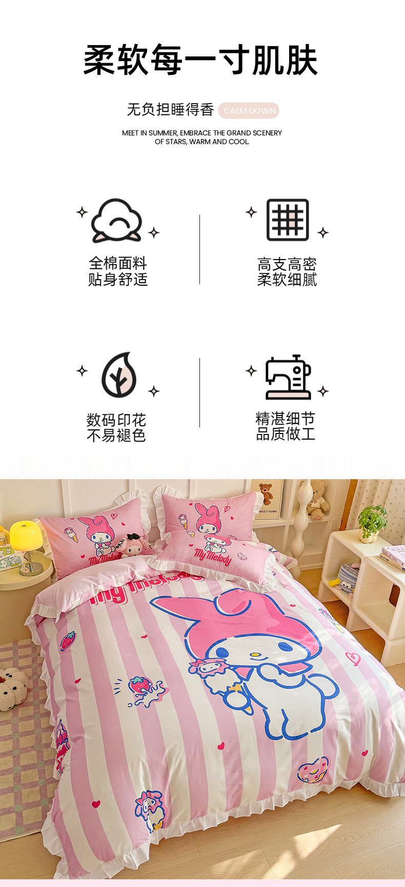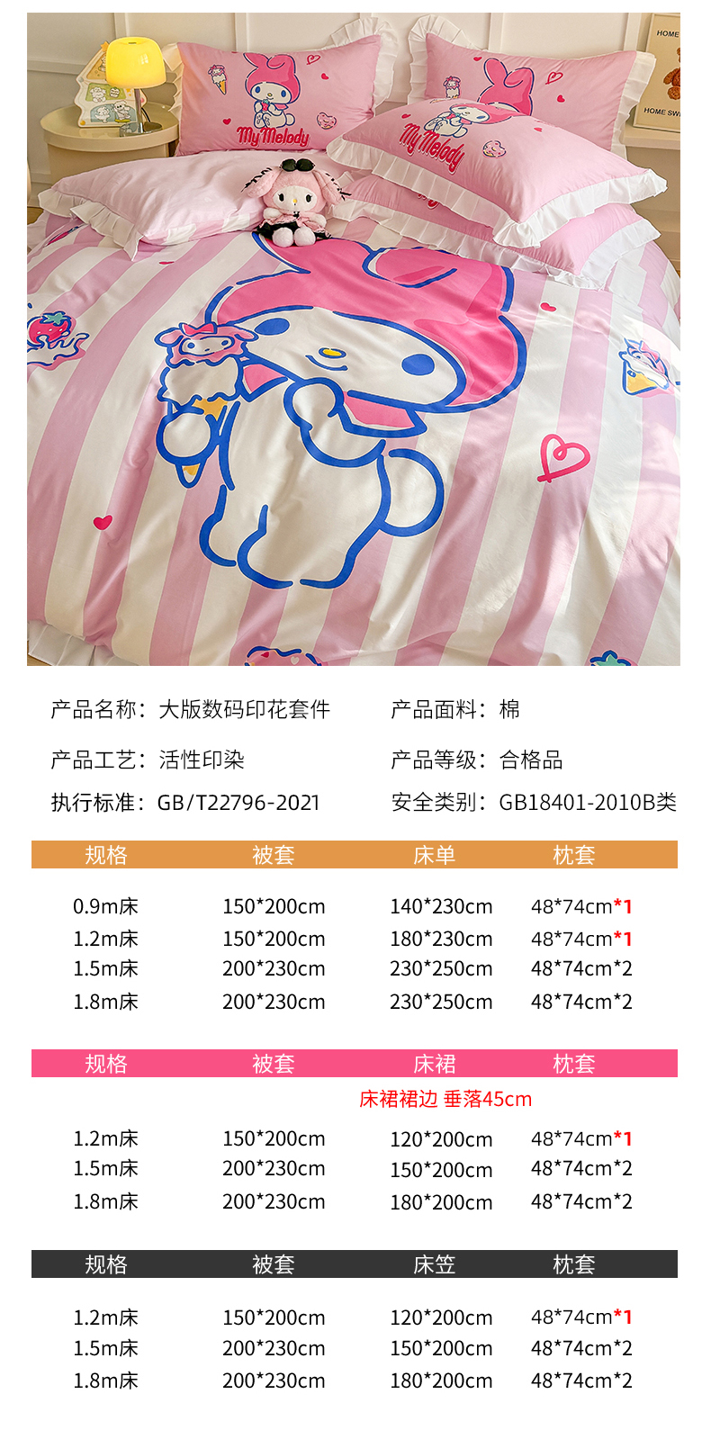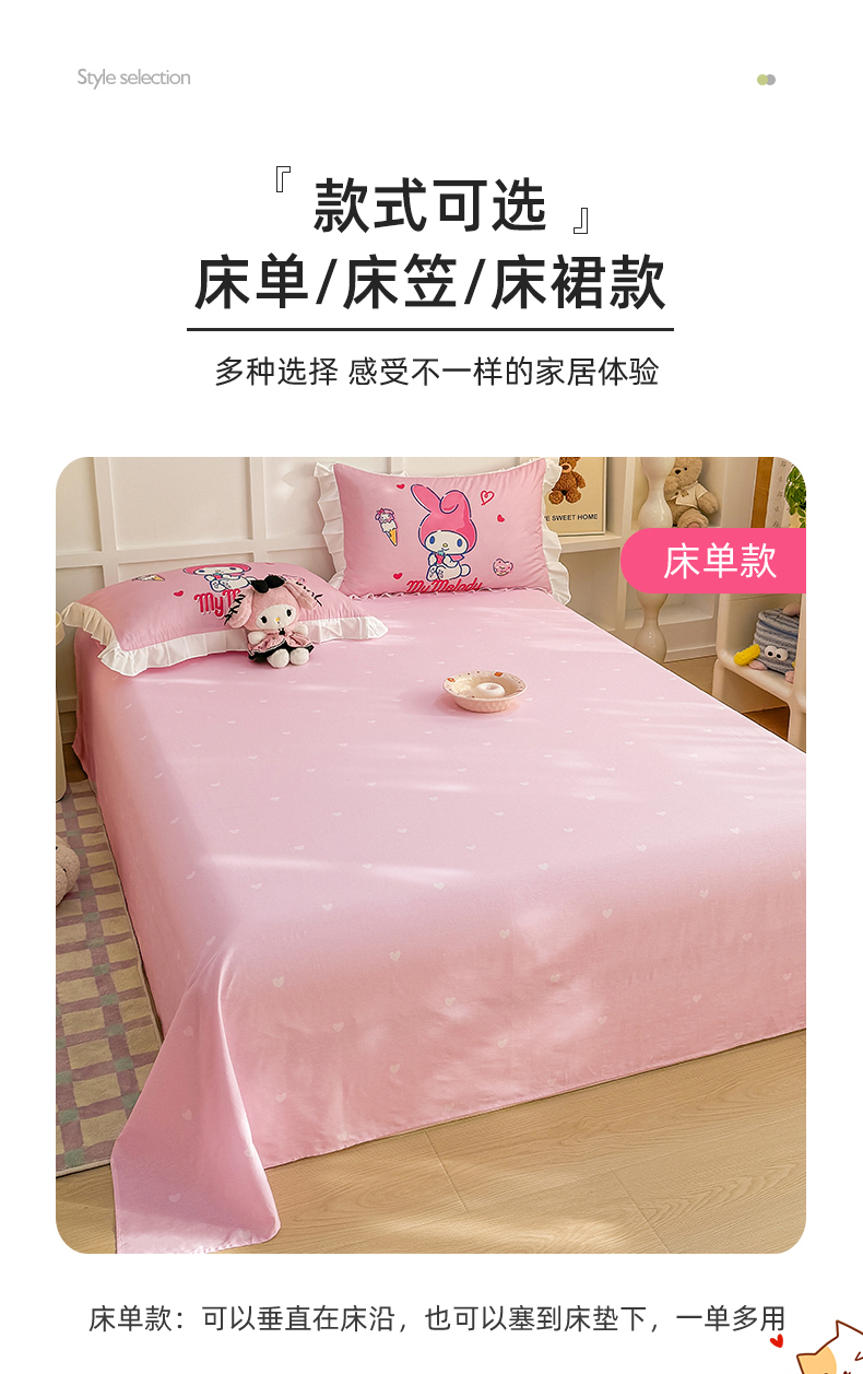 当前位置: 91家纺网 > 商品网购 > 床品套件 > 四件套 > 全棉普通四件套 > 玉元坊 2025年新款三丽鸥系列数码印花纯棉全棉床裙三件套四件套-花边款式 大版花边-甜筒美乐蒂
