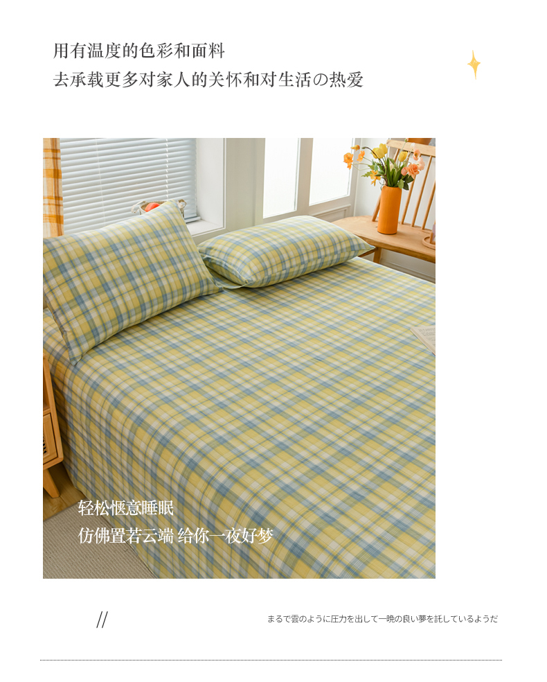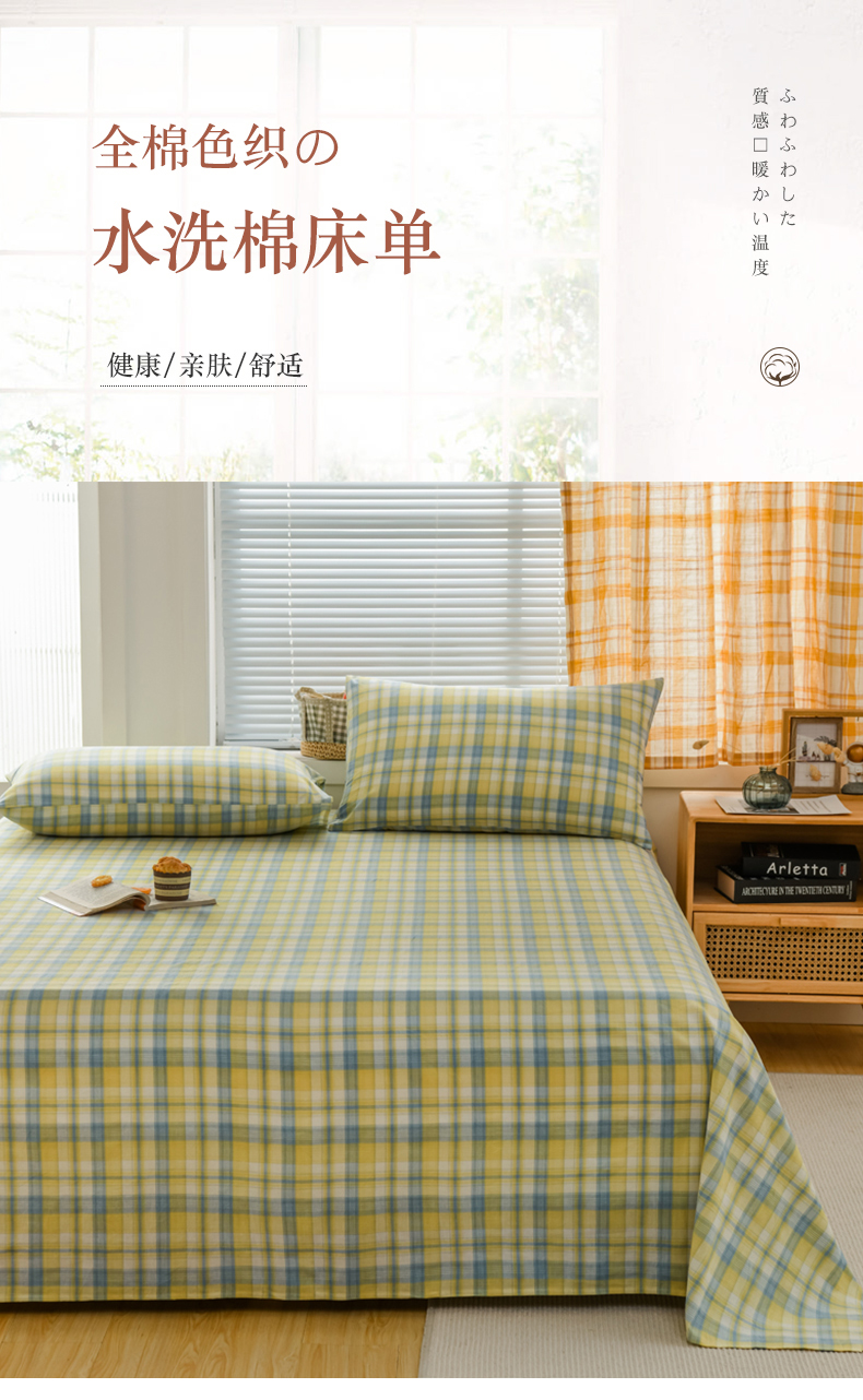 • 91家纺网 家纺一手货源 找家纺 柠萌家居 2025新款无印风全棉色织A类母婴级纯棉水洗棉床单 简爱黄格