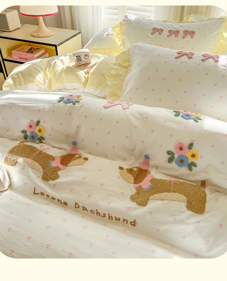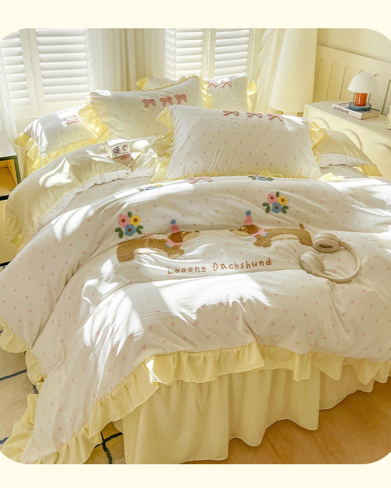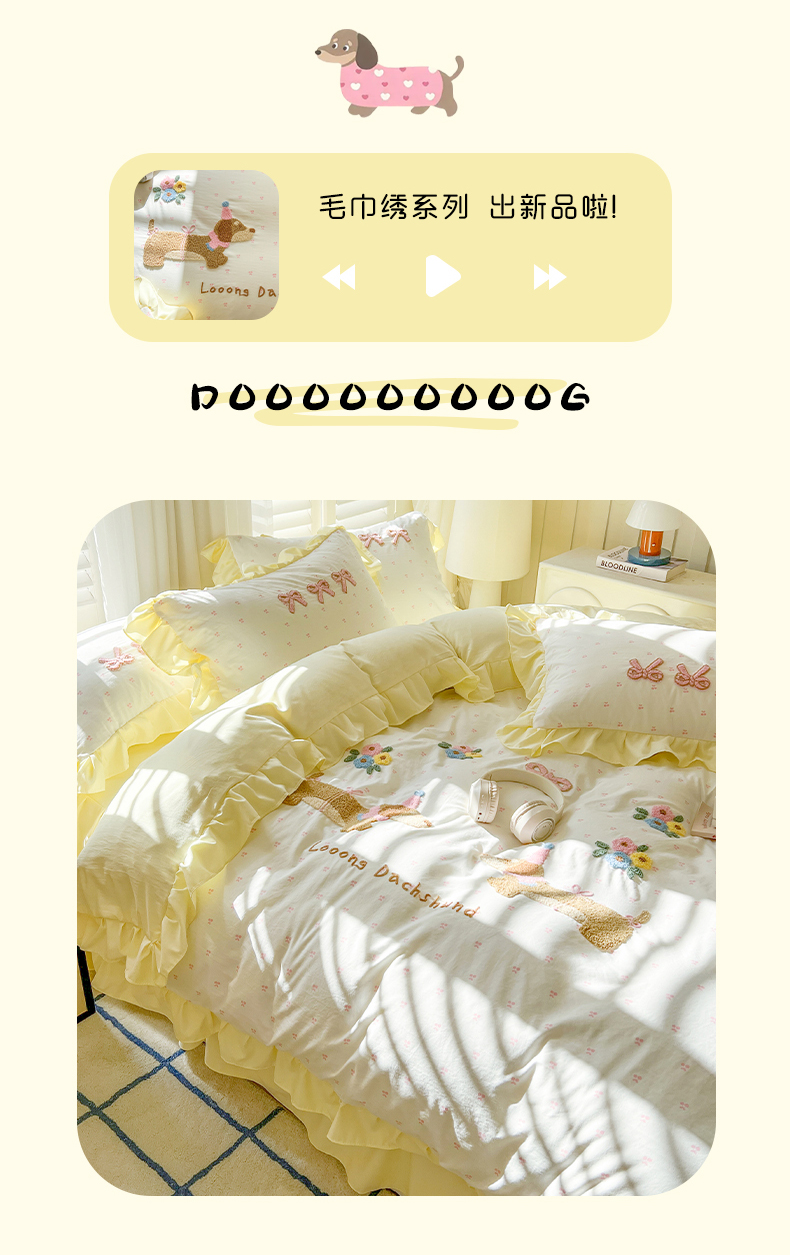 (总)韩都家居 2025新款韩版卡通风水洗棉毛巾绣四件套系列-花园狗