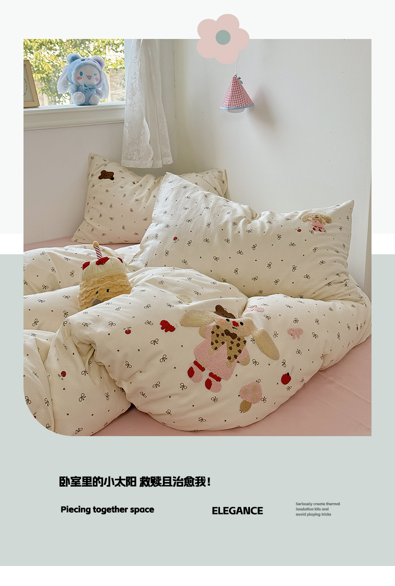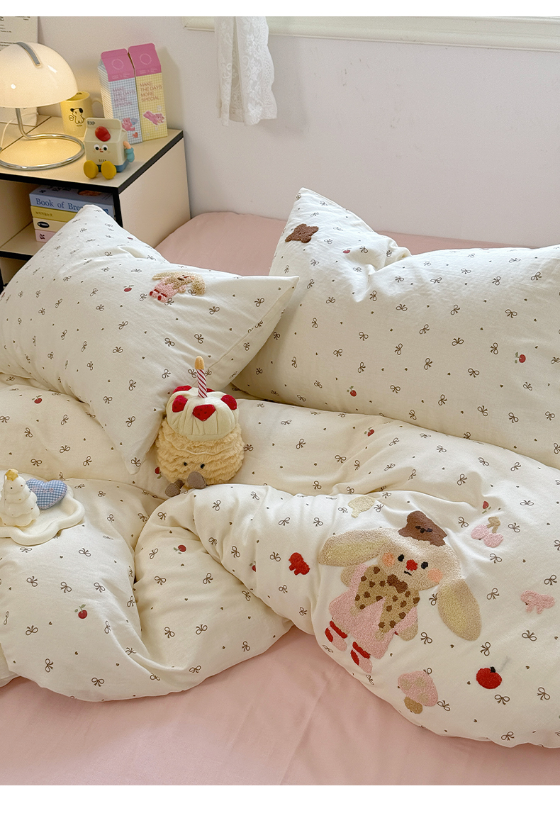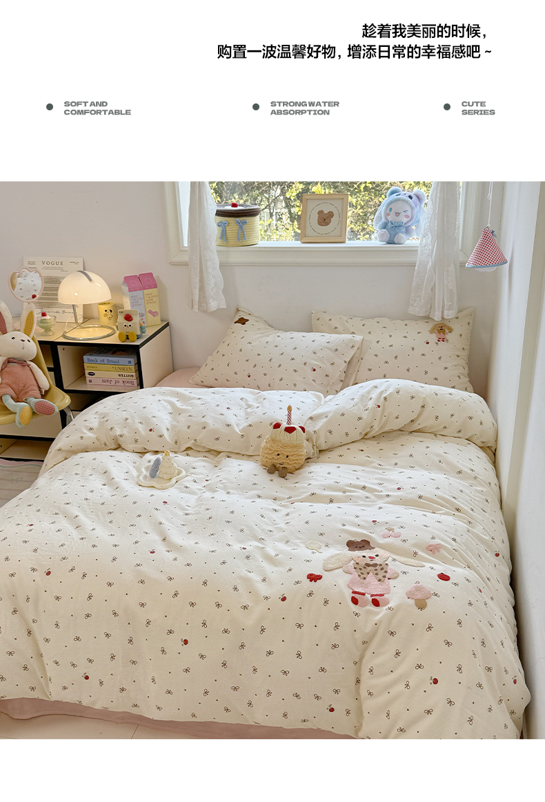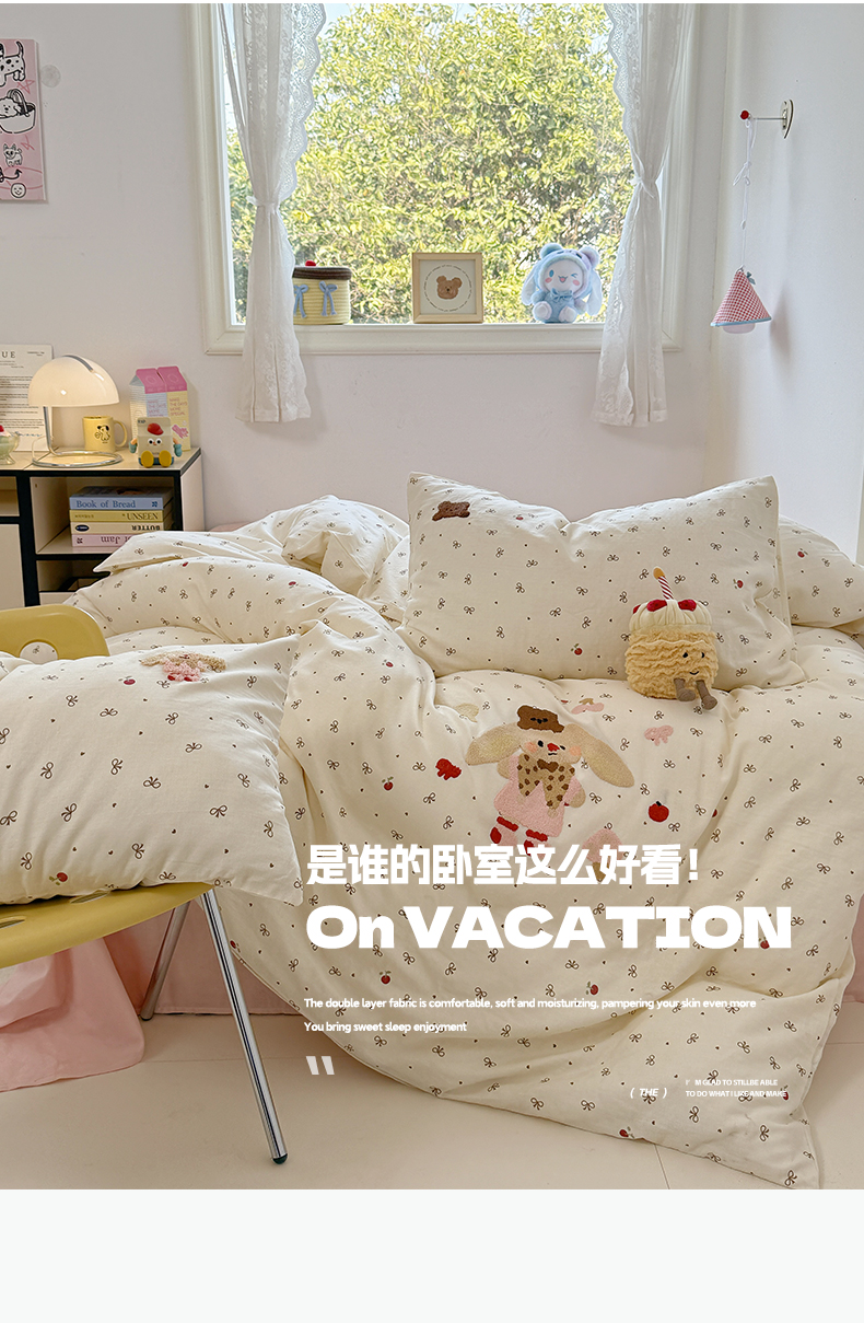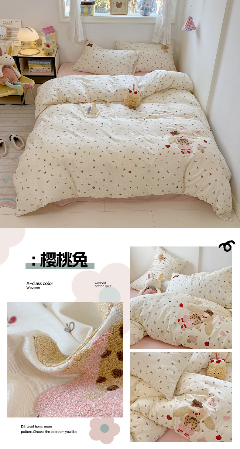 商品名称:澳萝拉2025春夏新款全棉纯棉双层纱毛巾绣四件套 樱桃兔