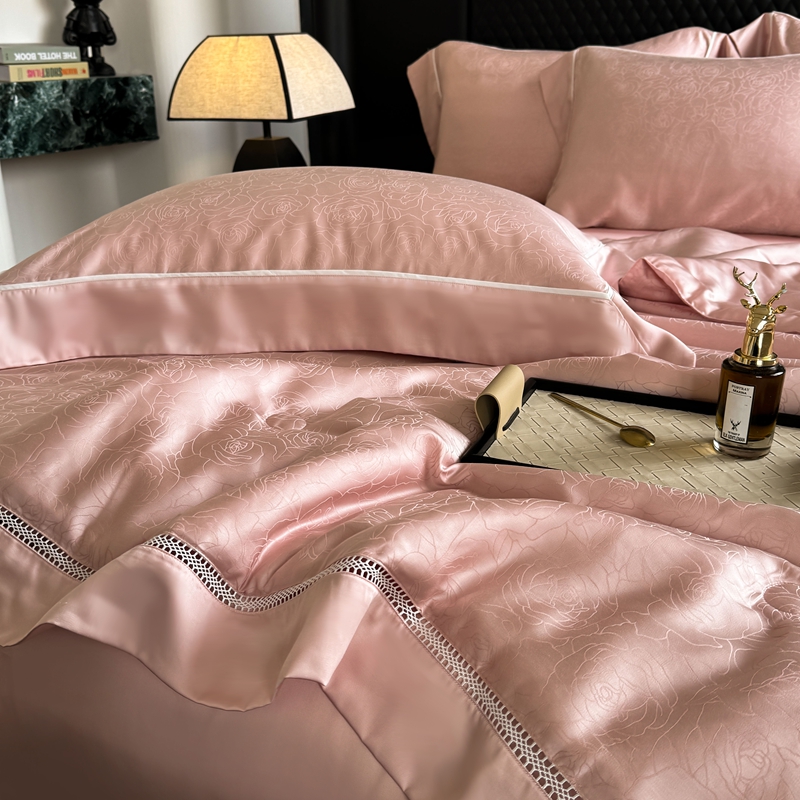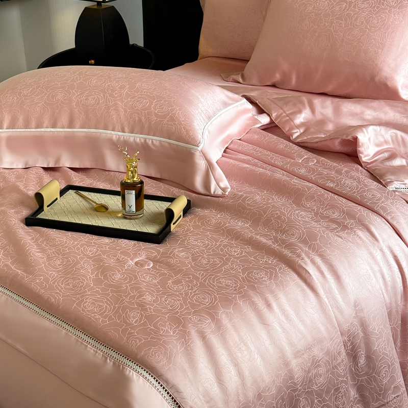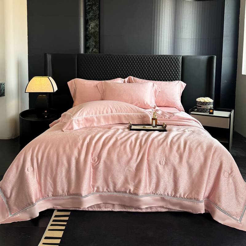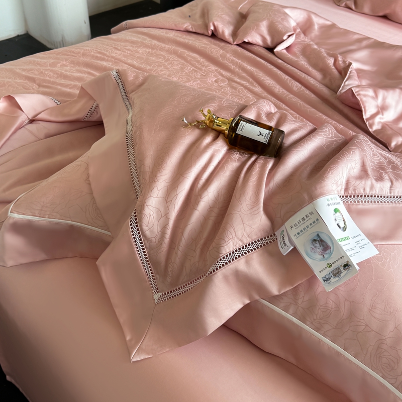 • 91家纺网 家纺一手货源 找家纺 娇逸2025新款60s兰精天丝提花镂空夏被四件套 微光-粉