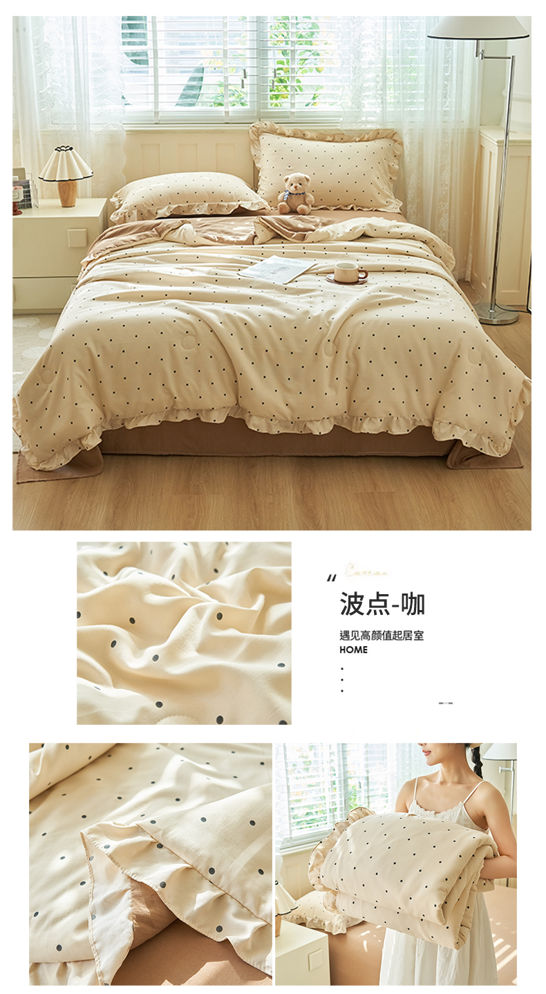 • 91家纺网 家纺一手货源 找家纺 换种生活 2025新款荷叶边款针织单夏被 四件套 波点-咖