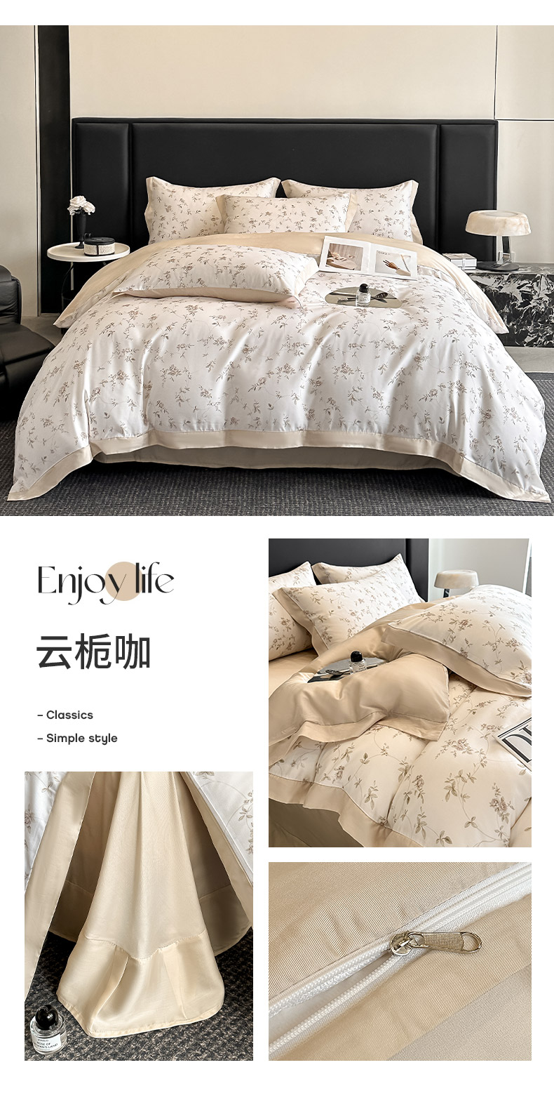 商品名称:金阳光家纺 2025新款高级简奢款莱赛尔数码印宽边四件套(带礼盒包装) 云栀咖