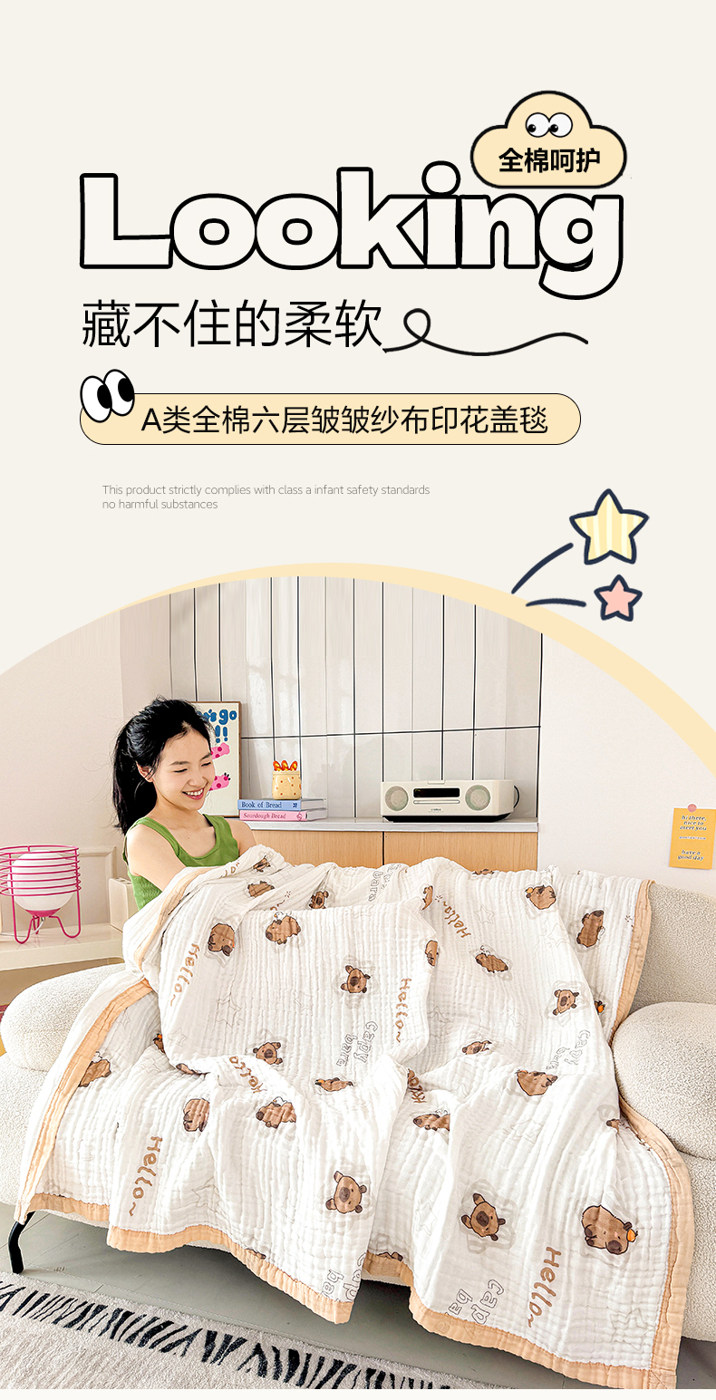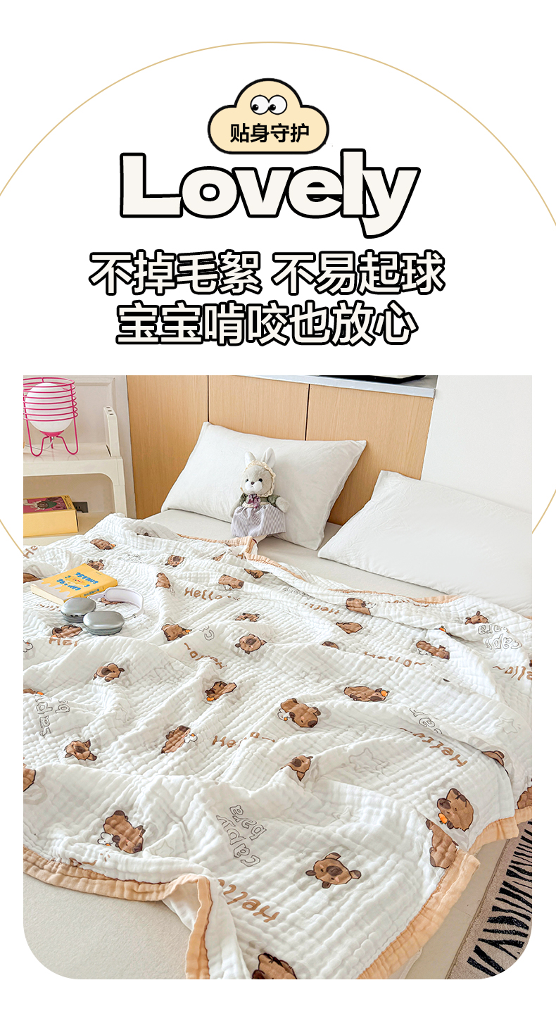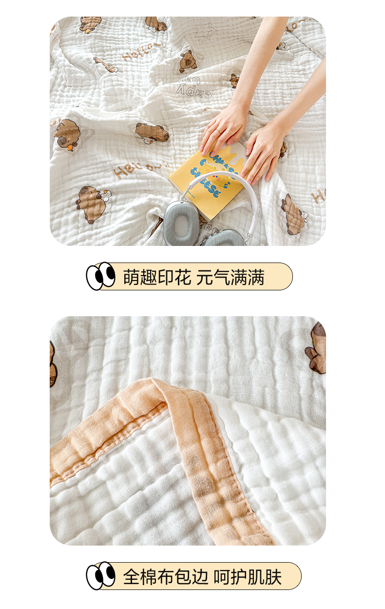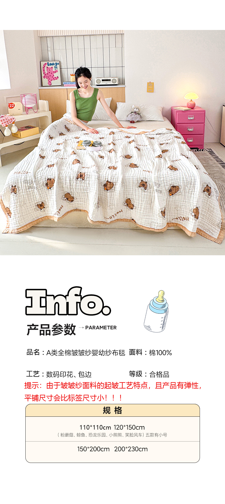商品名称:棠薇家纺 2025新款全棉六层皱皱纱婴幼毯泡泡纱印花盖毯包被浴巾 小熊熊