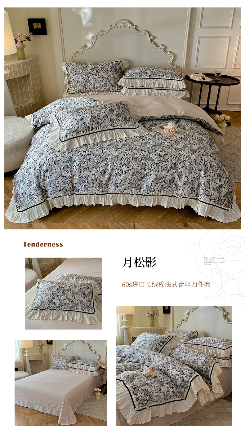商品名称:巧玲珑 2025新款法式蕾丝印花60支进口长绒棉四件套 月松影