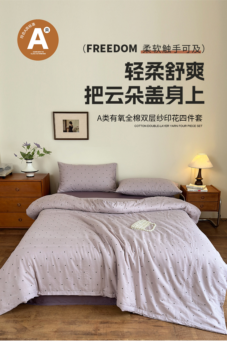 当前位置: 91家纺网 > 商品网购 > 床品套件 > 四件套 > 双层纱四件套 > 亿梵家居 2025新款A类母婴级有氧全棉纯棉双层纱纯棉印花四件套-床拍图半岛铁盒-紫