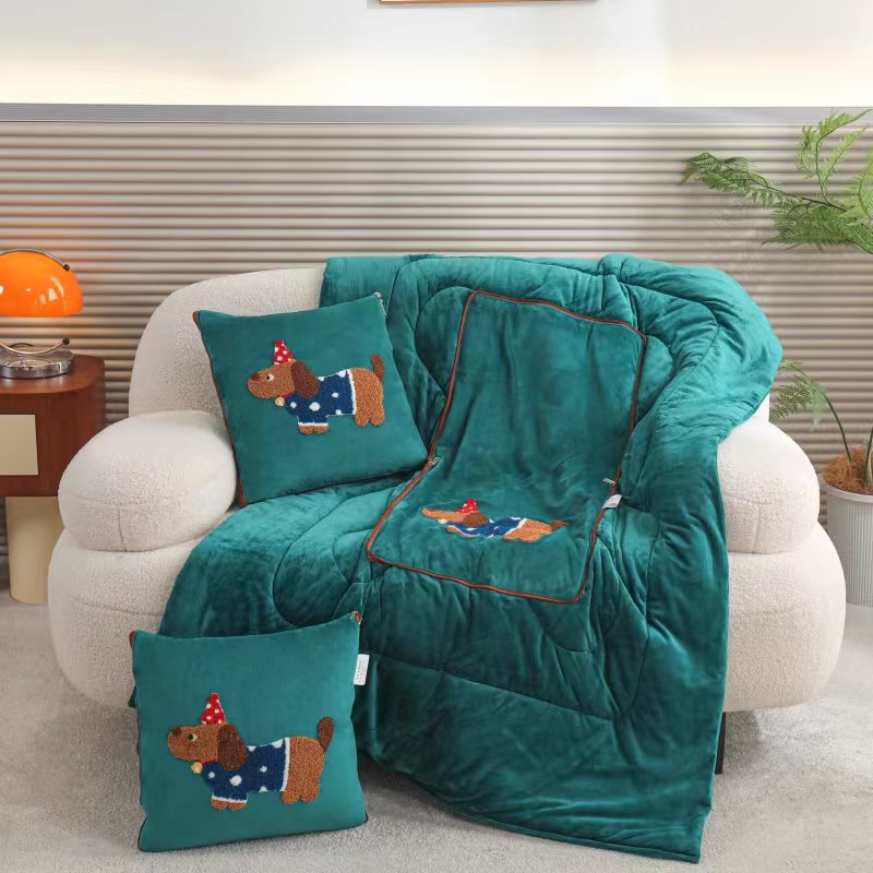 枕芯真意 2025新款毛巾绣刺绣小狗系列多功能抱枕被--腊肠狗 腊肠狗-墨绿