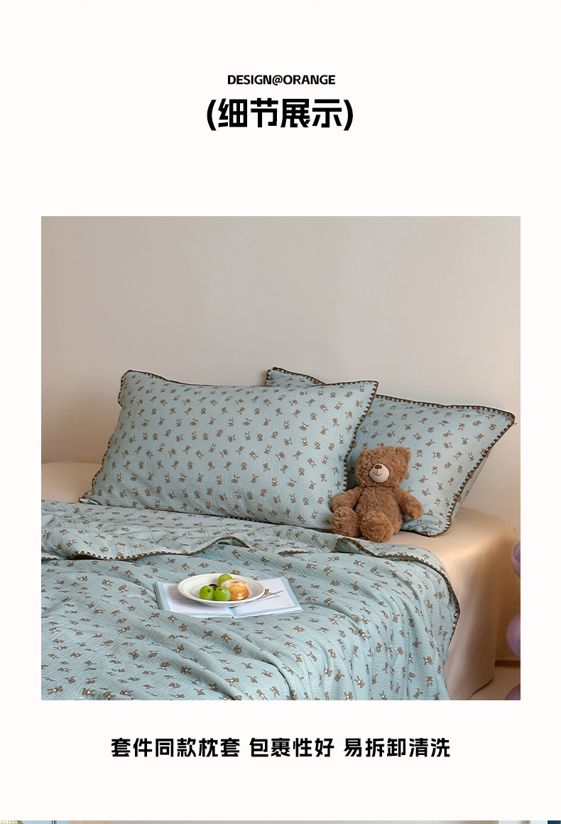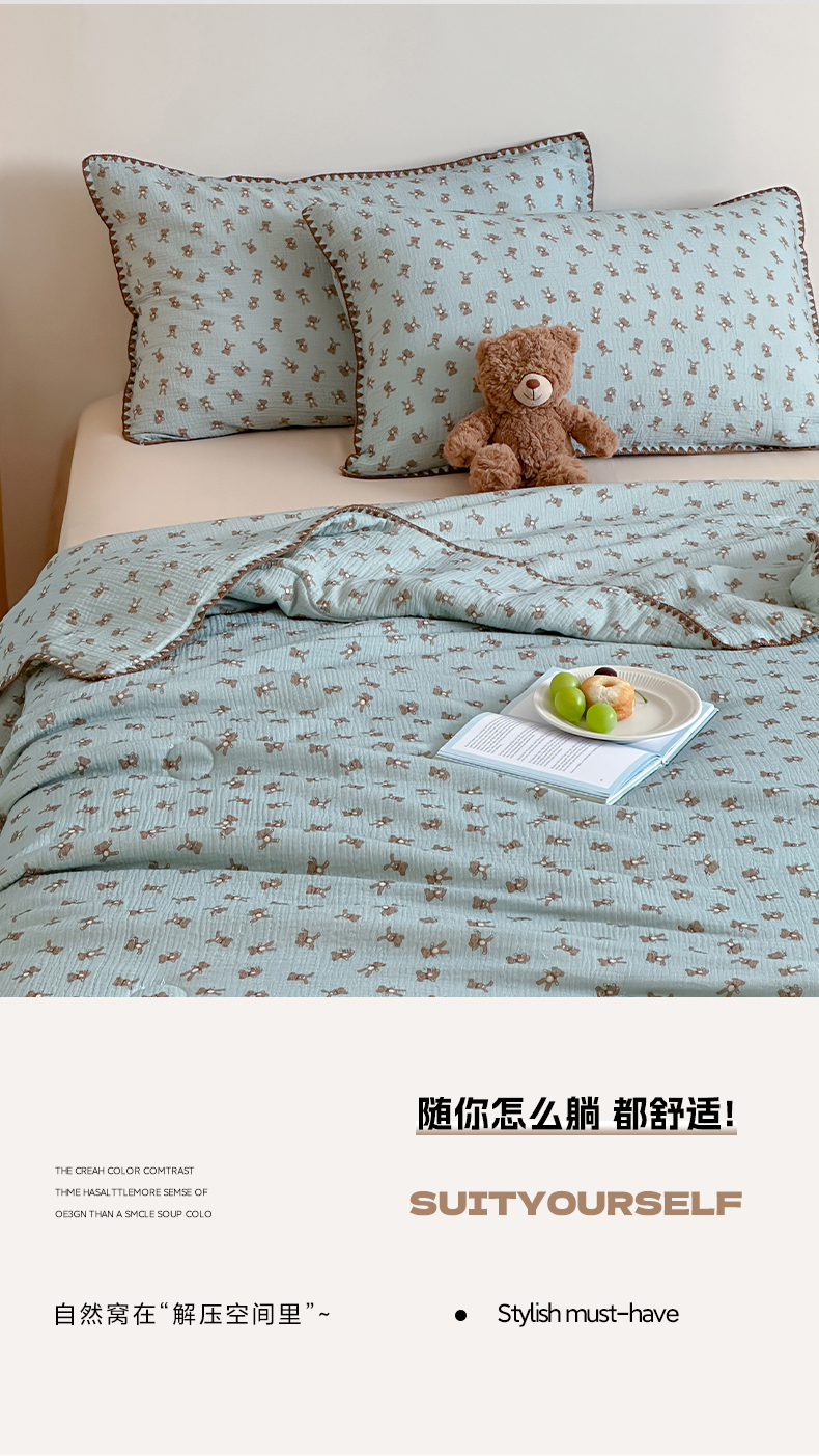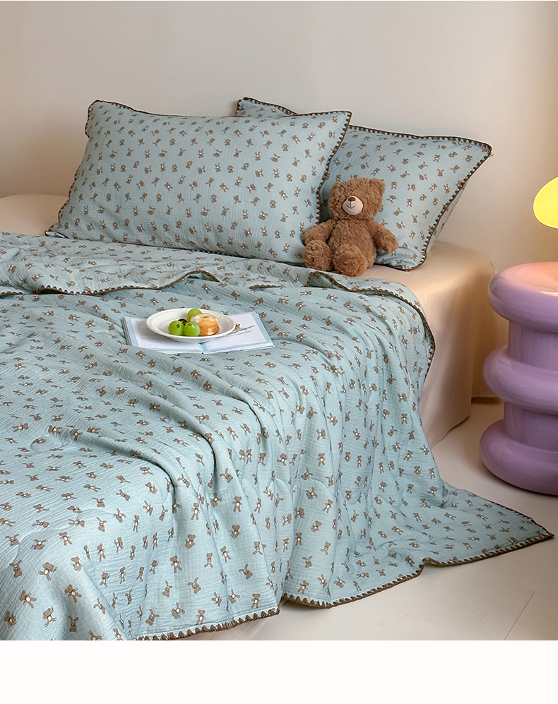 三朵家纺 2025春夏新款全棉纯棉双层绉绉纱三角针夏被夏凉被空调被 蓝色熊仔