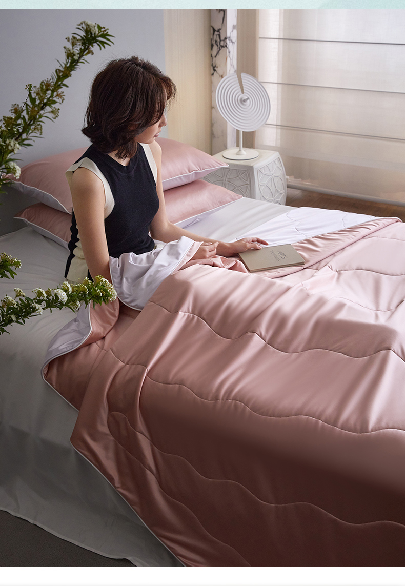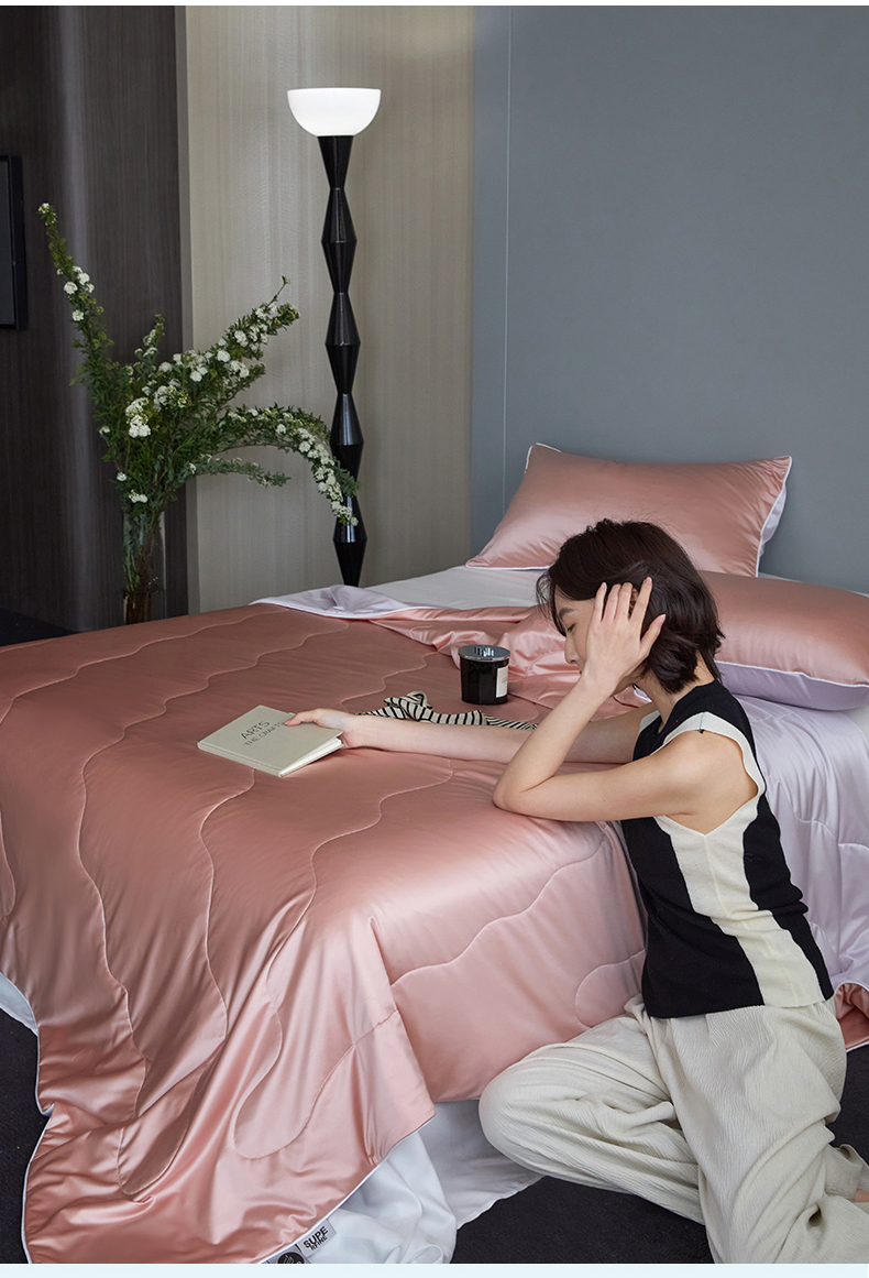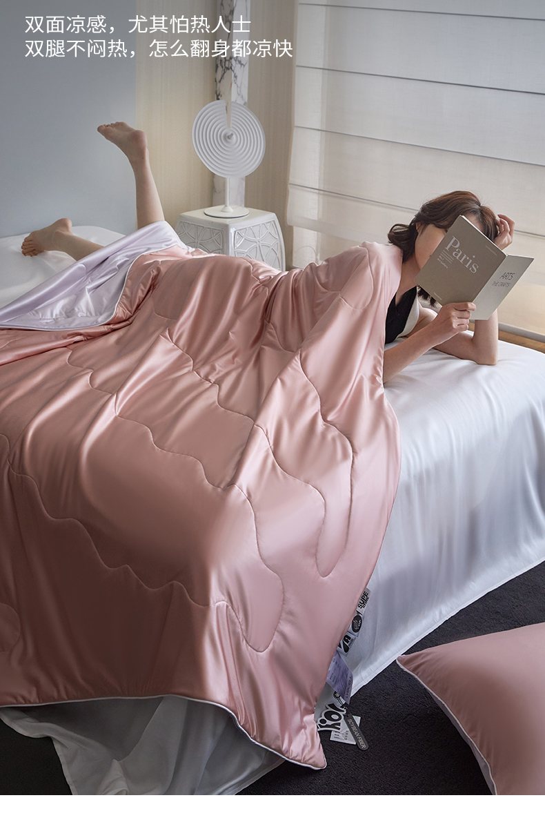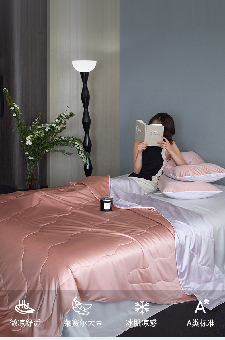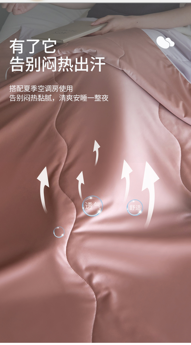 头等舱 2025新款水光缎冰肌锦氨A类55植物大豆7A抗菌夏被配包装模特图 水光粉配水光紫