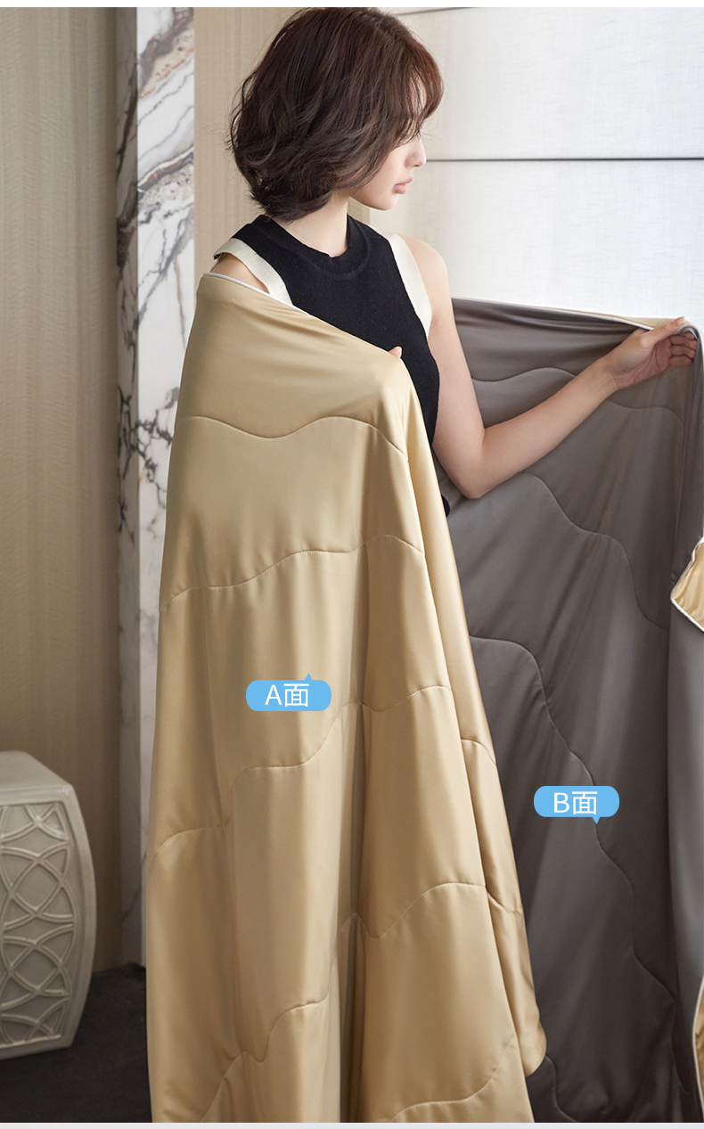 商品名称:头等舱 2025新款水光缎冰肌锦氨A类55植物大豆7A抗菌夏被配包装模特图 香槟咖配水光灰