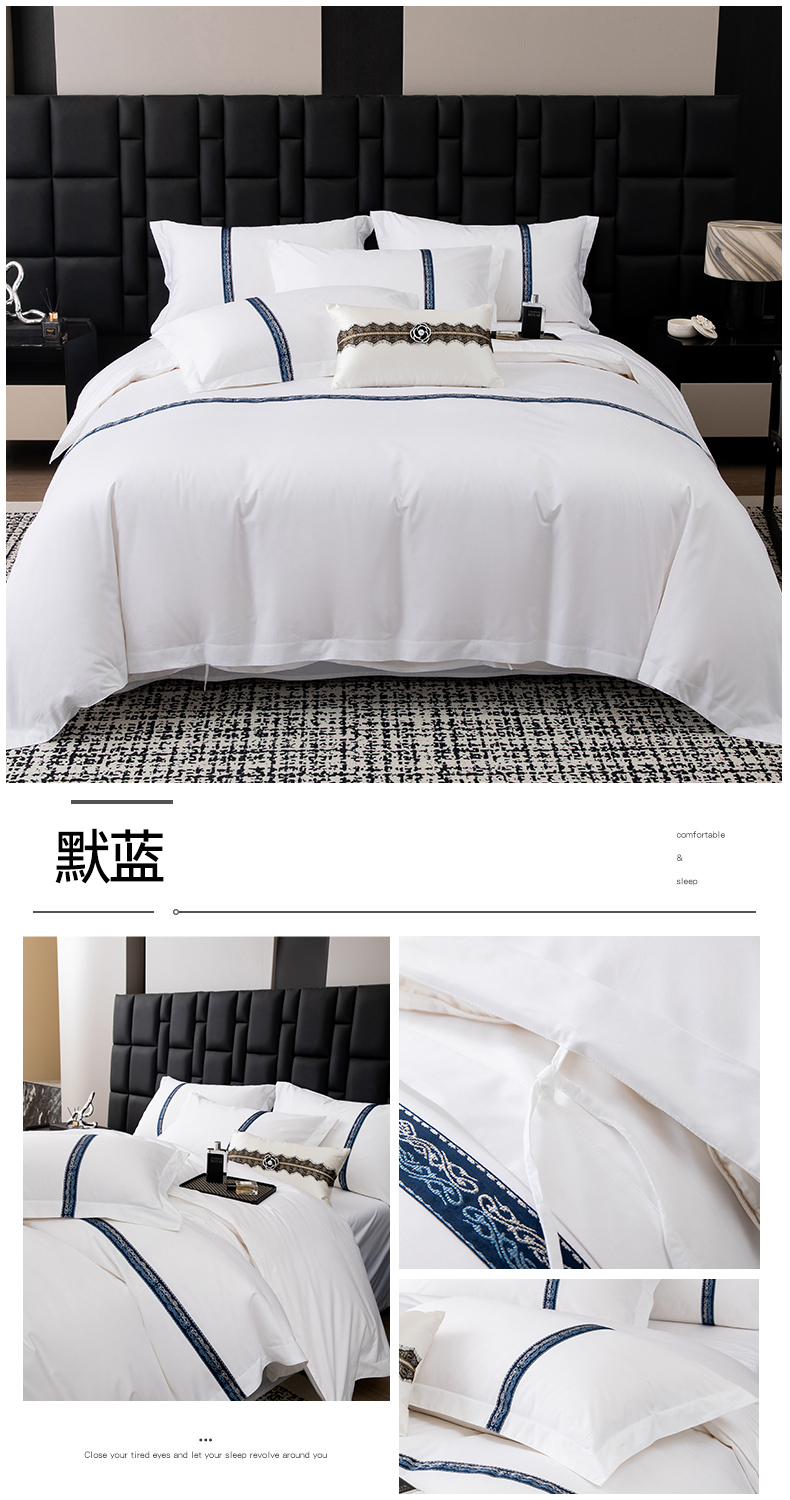 当前位置: 91家纺网 > 商品网购 > 床品套件 > 四件套 > 全棉普通四件套 > 优必恩 2025新款高支高密民宿酒店织带款四件套套件 墨蓝