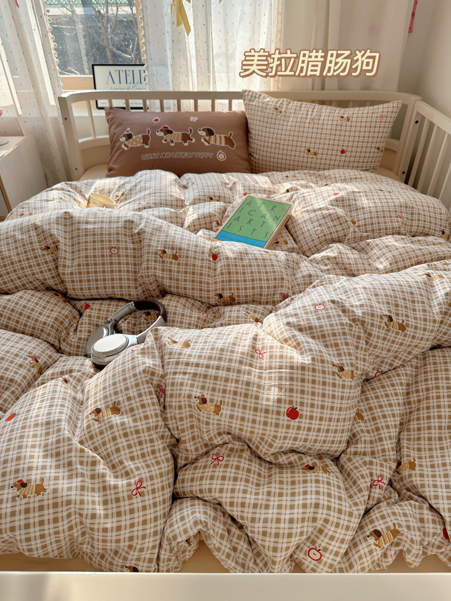 (总)顾里家纺 2024新款韩系腊肠狗毛巾绣牛奶绒四件套,粉格腊肠狗,黄格腊肠狗,咖格腊肠狗,蓝格腊肠狗,绿格腊肠狗