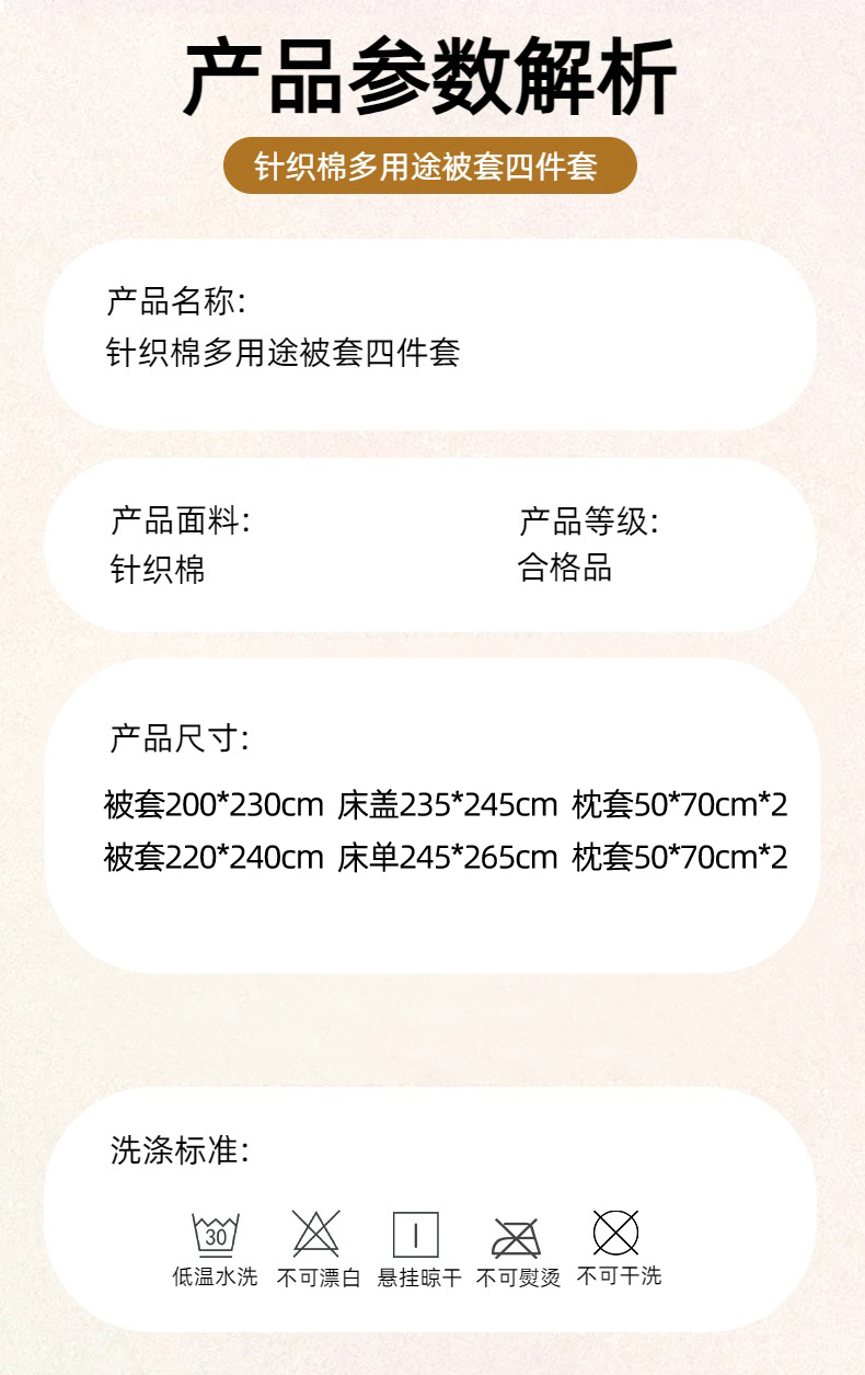 标准:被套200*230cm床盖250*250cm枕套50*70cm*2
