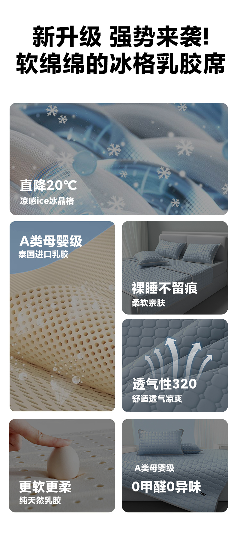 (总)简一 2025新款无印风方块乳胶凉席系列-床单款,浅蓝,浅粉,浅灰,浅黄,浅绿