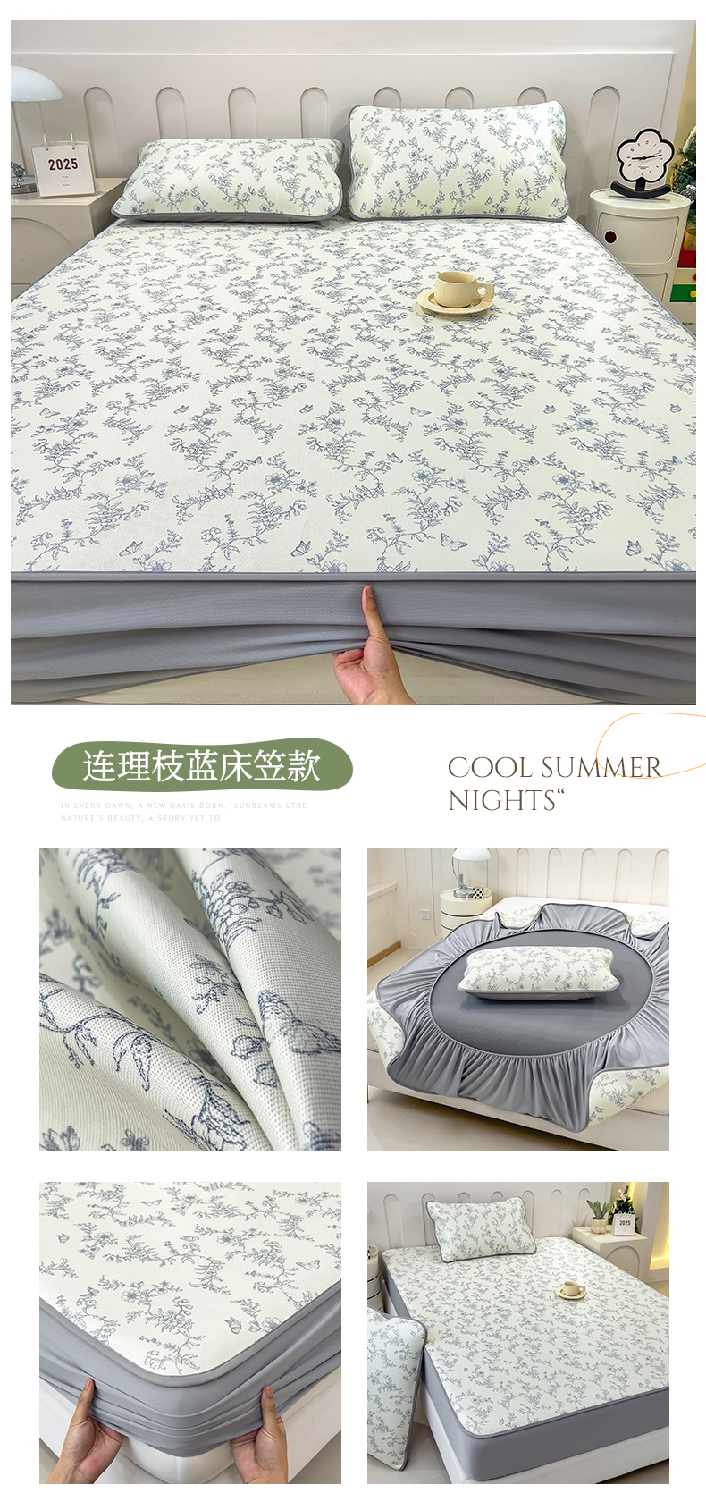 2025年新款600D丝滑冰丝凉席-床笠款 连理枝蓝