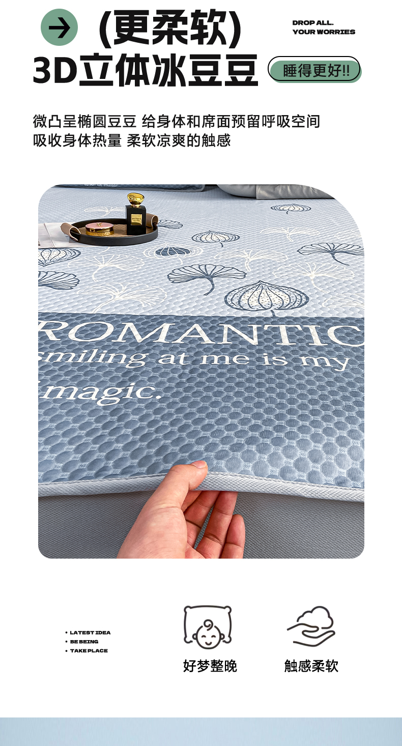 商品名称:慕梵家居 2025新款大版印花冰豆豆凉席席子床笠款三件套 爱家-灰
