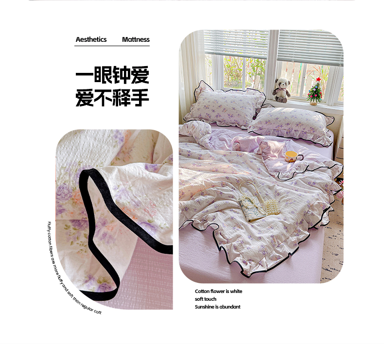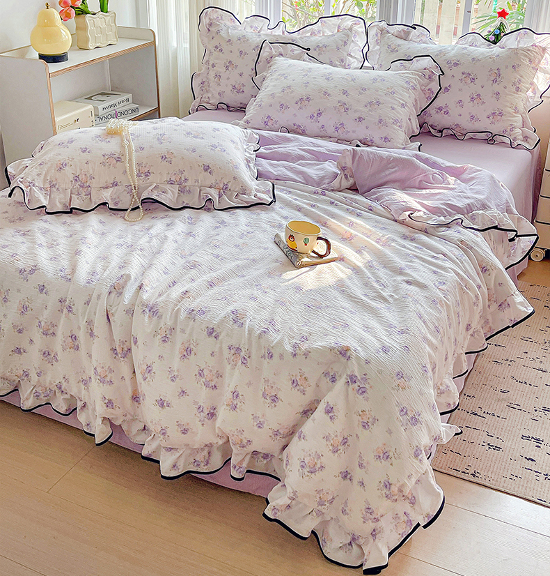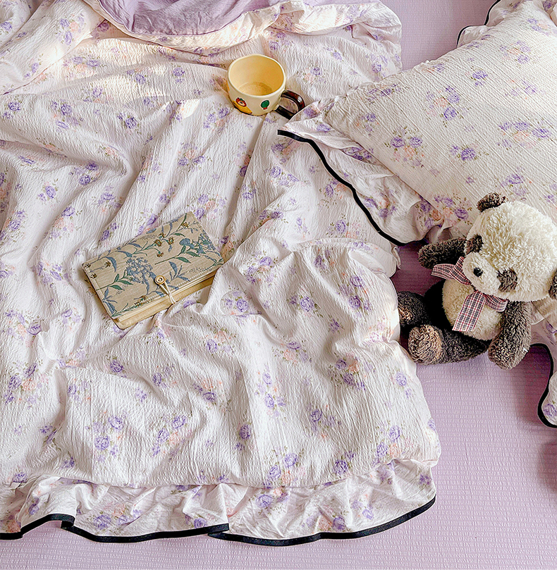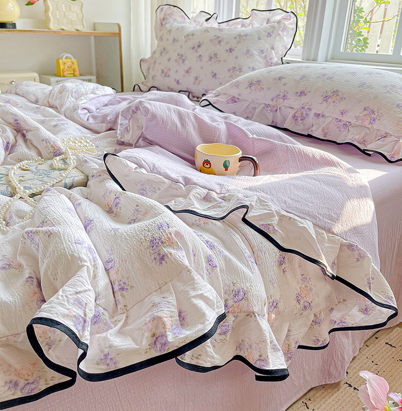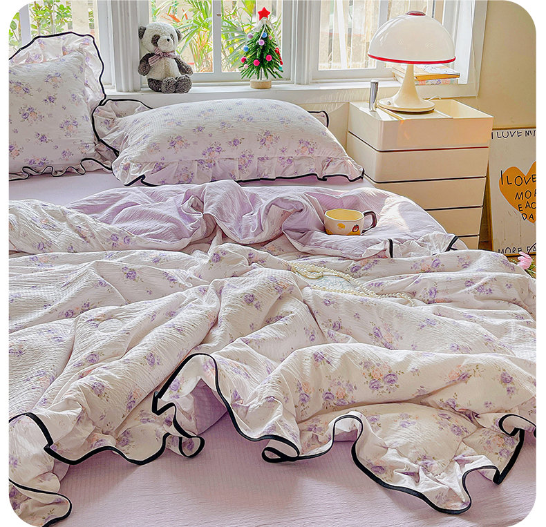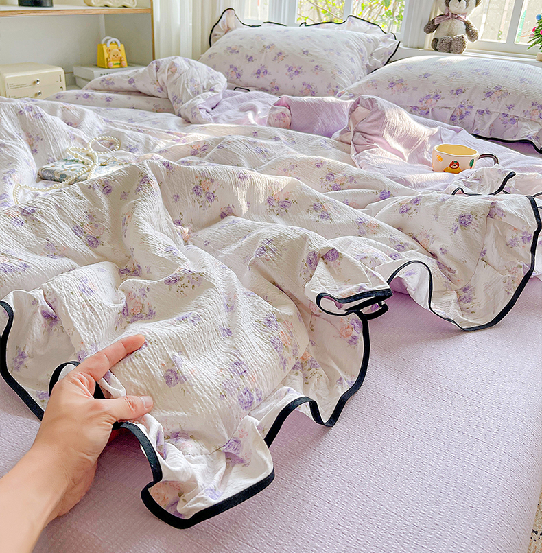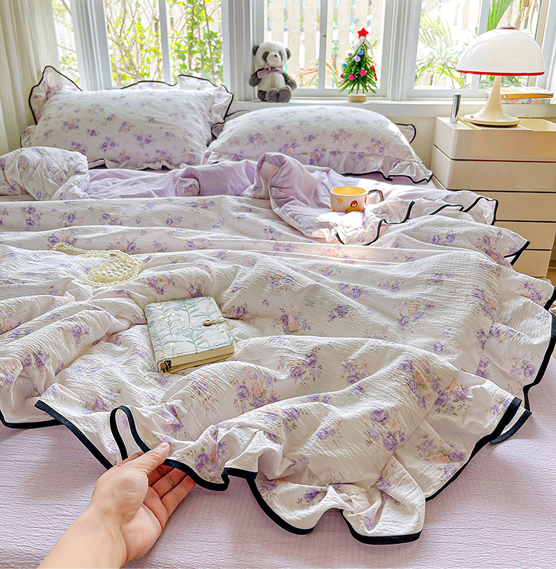 暖芯优选 2025(优选)新款皱皱双层纱荷叶大花边夏被空调被夏凉被三件套 紫薇花园