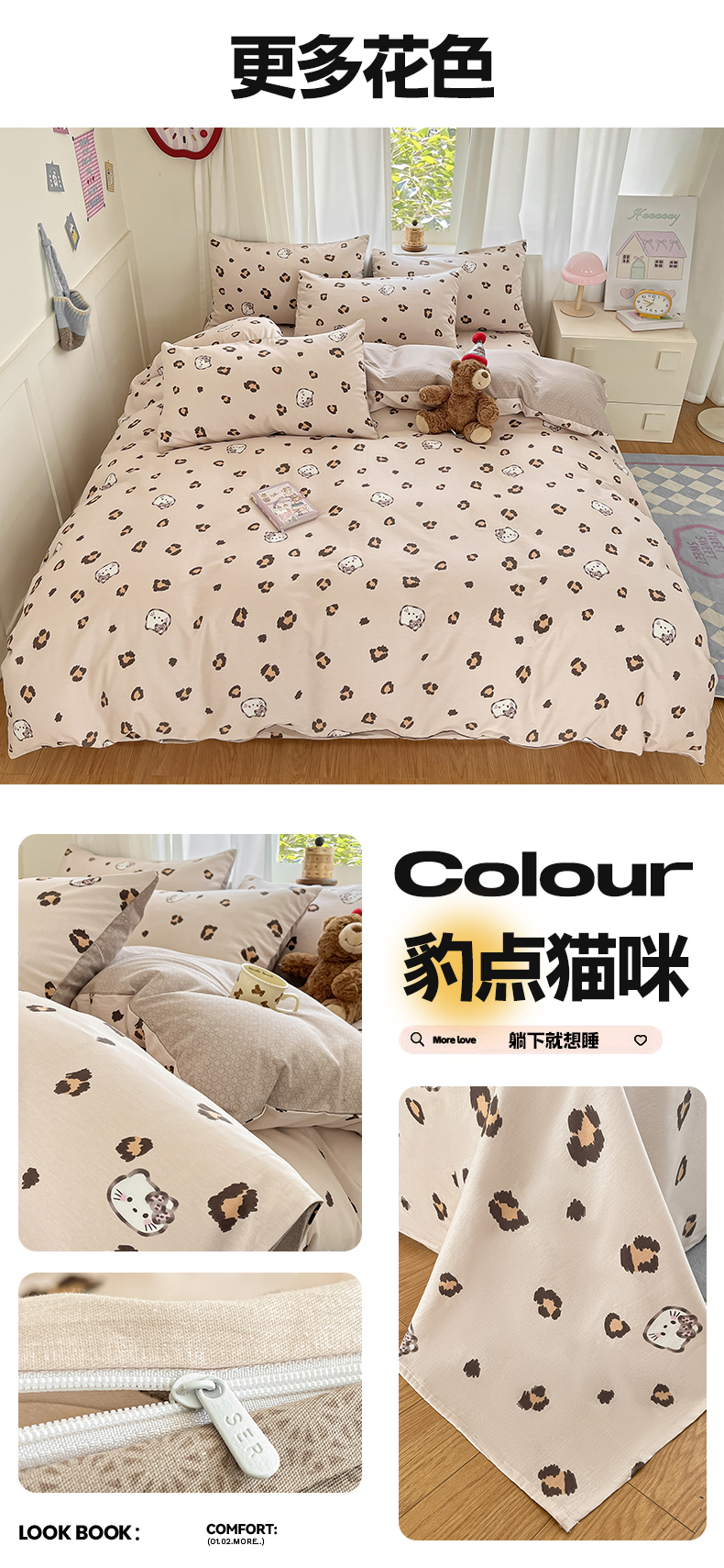 商品名称:首尔家纺 2025新款学生季全棉跑量款四件套系列卡通小清新AB版学生三件套 豹点猫咪