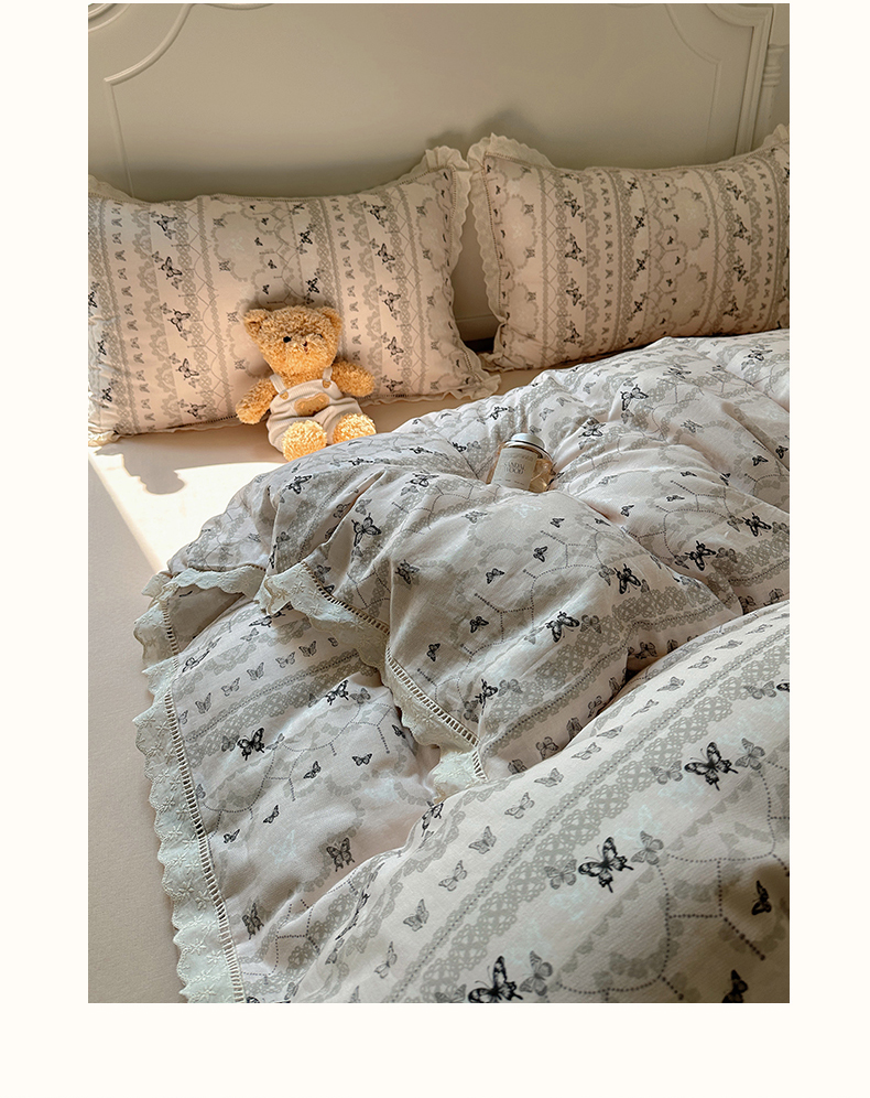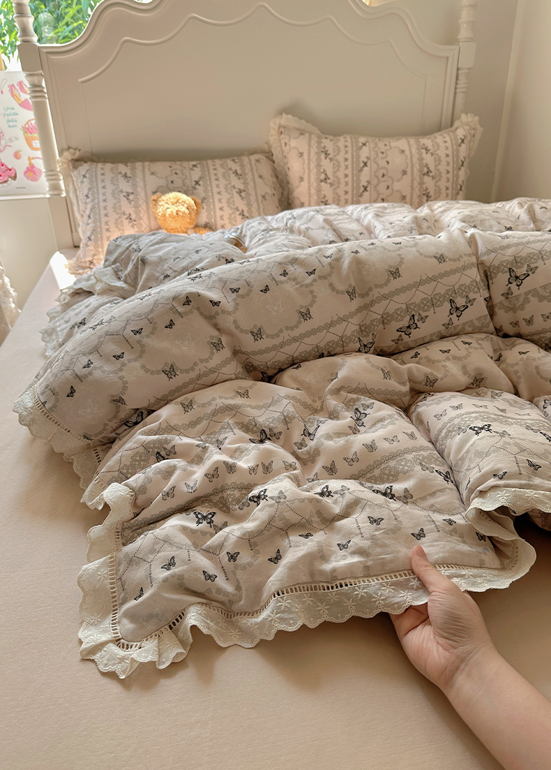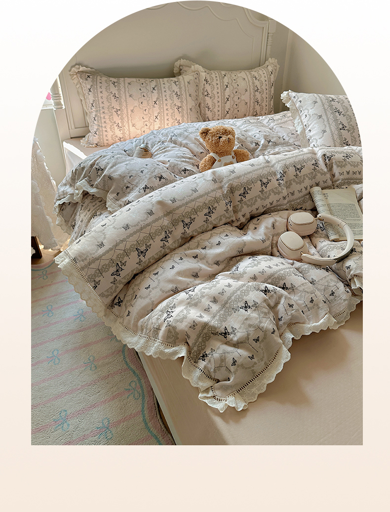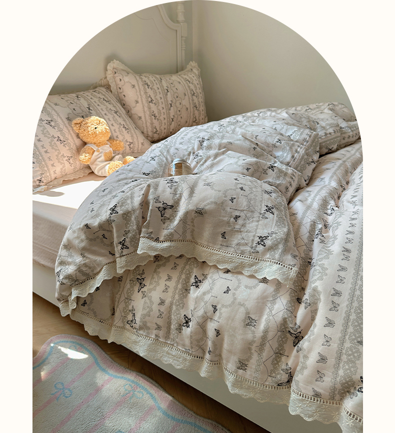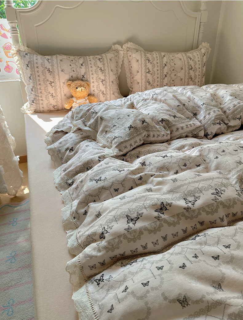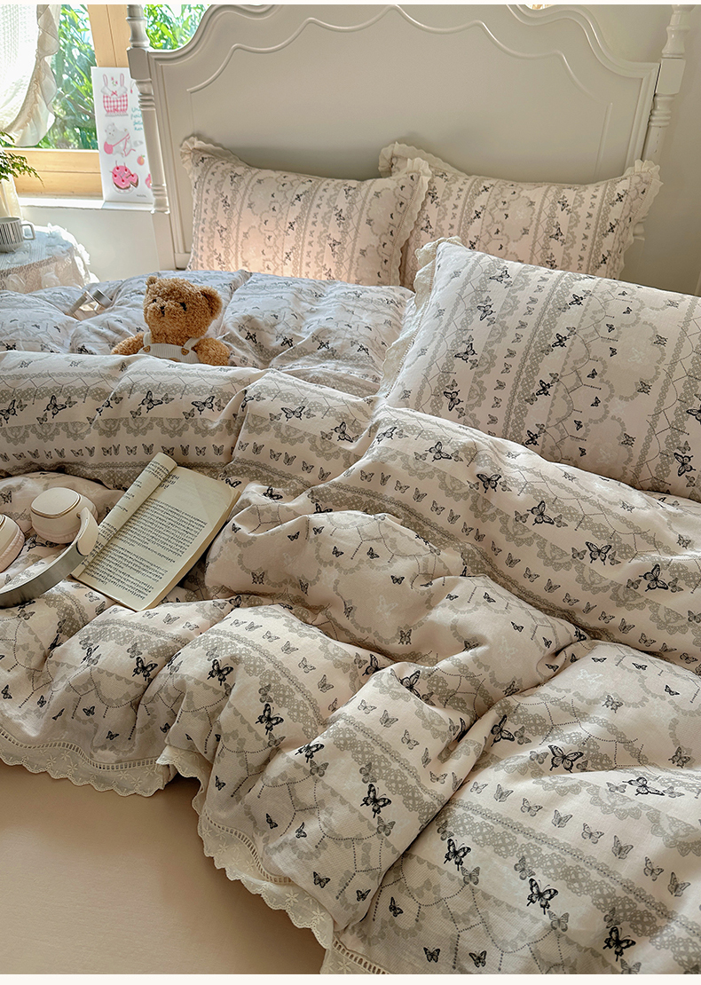 当前位置: 91家纺网 > 商品网购 > 床品套件 > 四件套 > 全棉普通四件套 > 瑞莱 2025新款全棉纯棉A类有氧双层纱镂空花边四件套 蝴蝶飞飞
