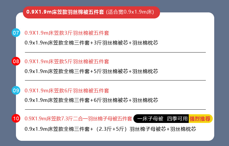 【床笠款】90x200cm三件套+7.3斤羽丝棉子母被五件套 | ¥179.00 |