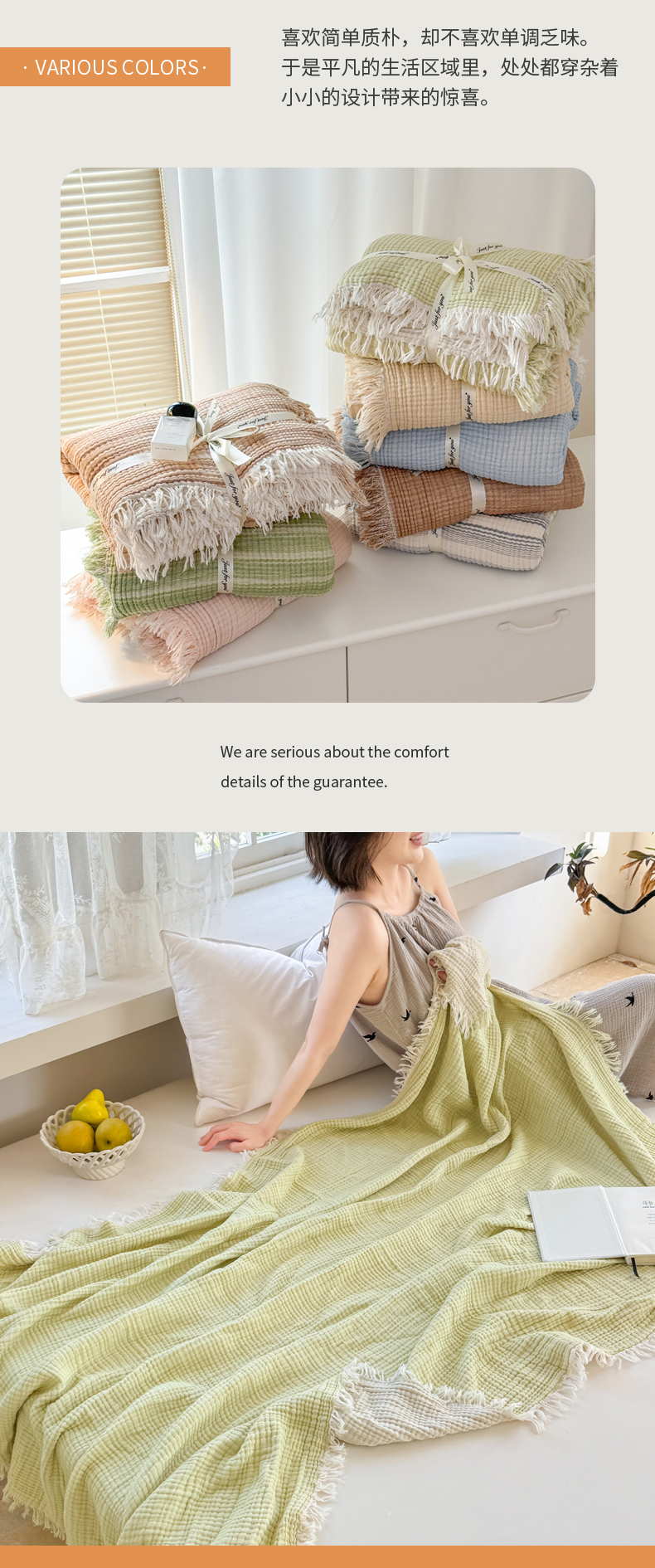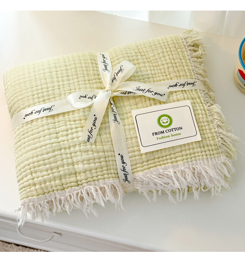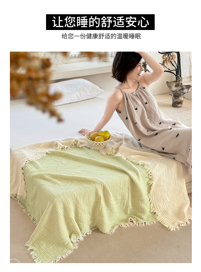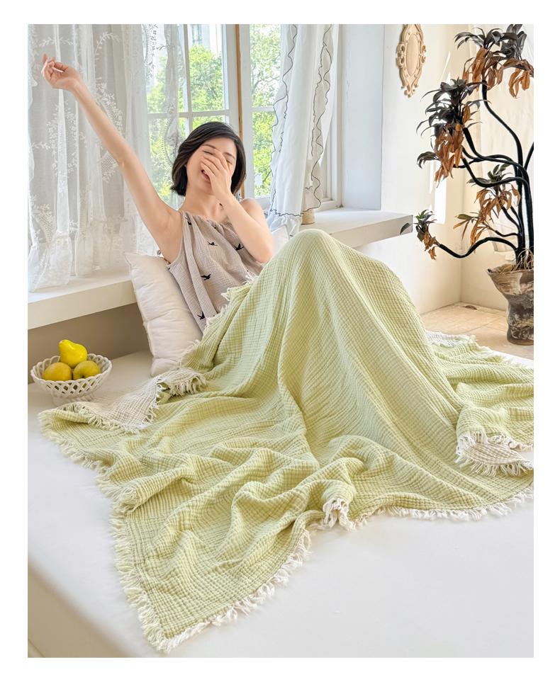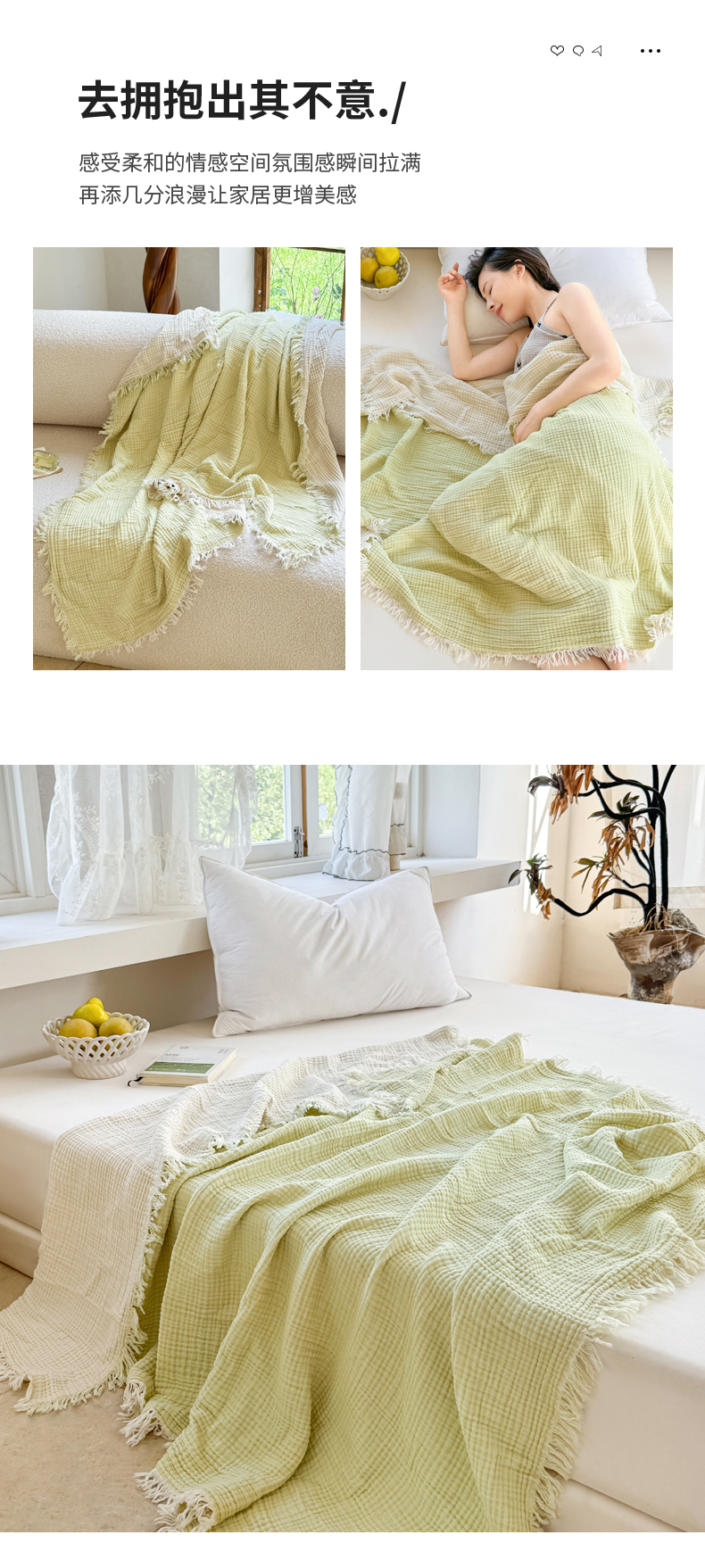 商品名称:丹本家纺 2025新款双层纱流苏全棉纯棉毯纯棉流苏款盖毯夏被夏凉被空调被 浅绿色