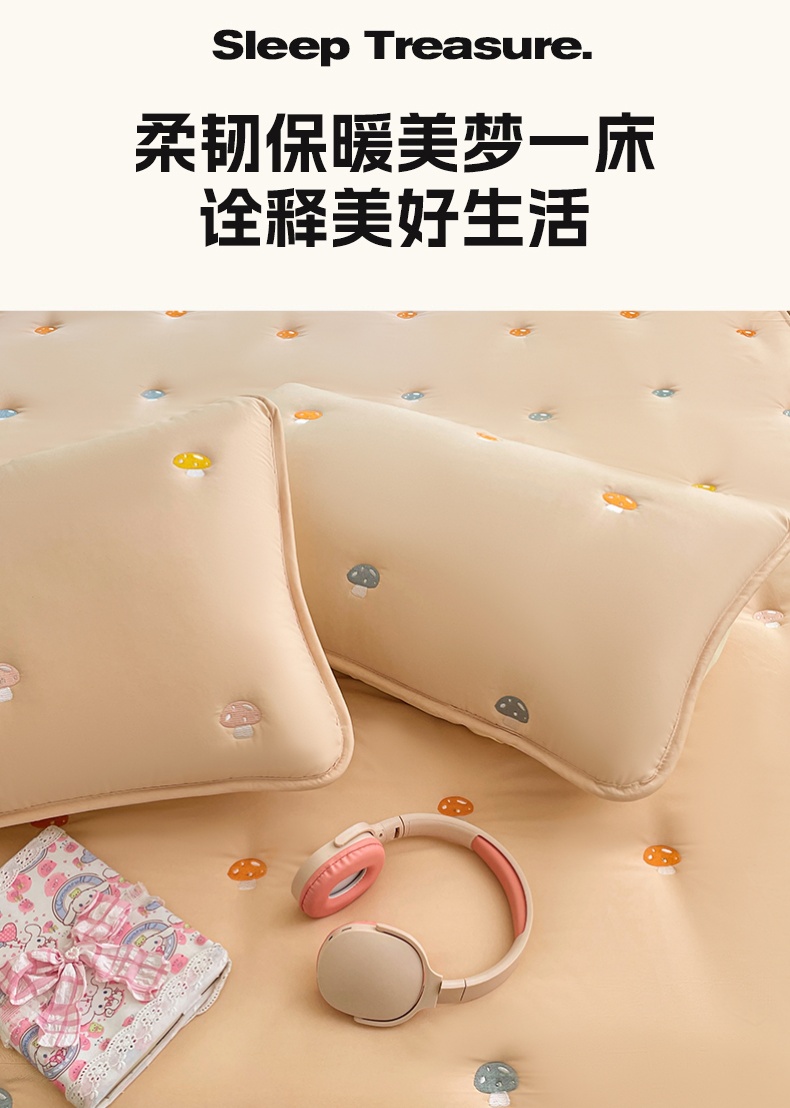 商品名称:圣比熊 2025新款水洗棉刺绣夹棉枕套加厚宿舍学生枕头套枕芯套 蘑菇屋-奶茶咖