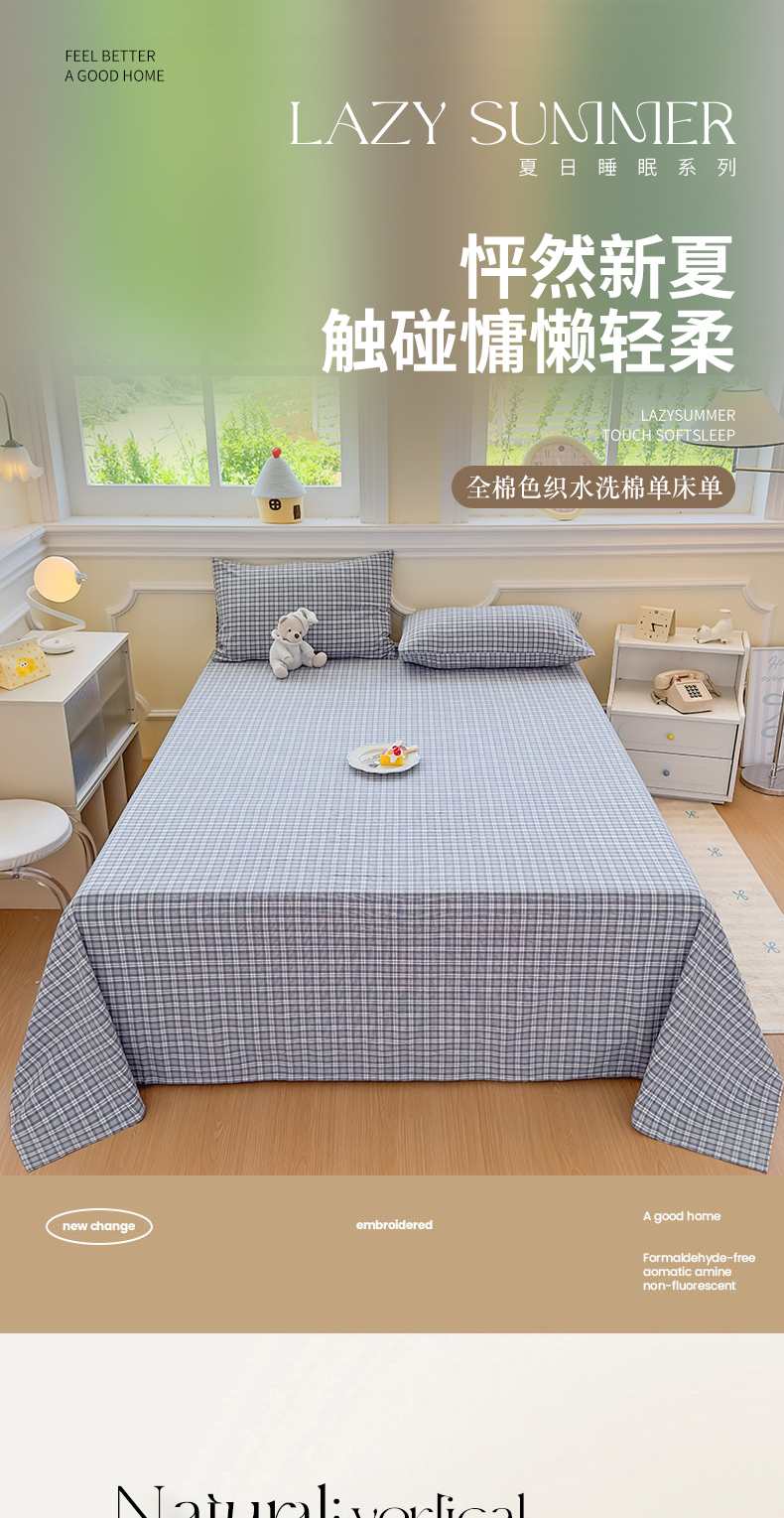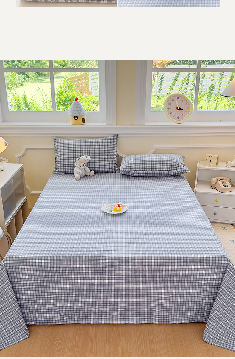 菡宝 2025新款全棉纯棉色织水洗棉单床单 蓝格调