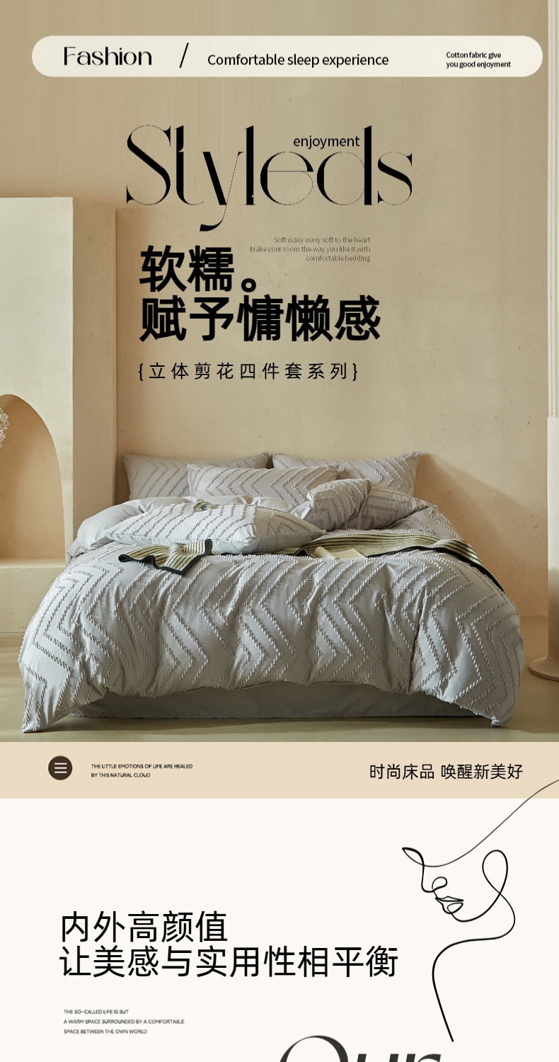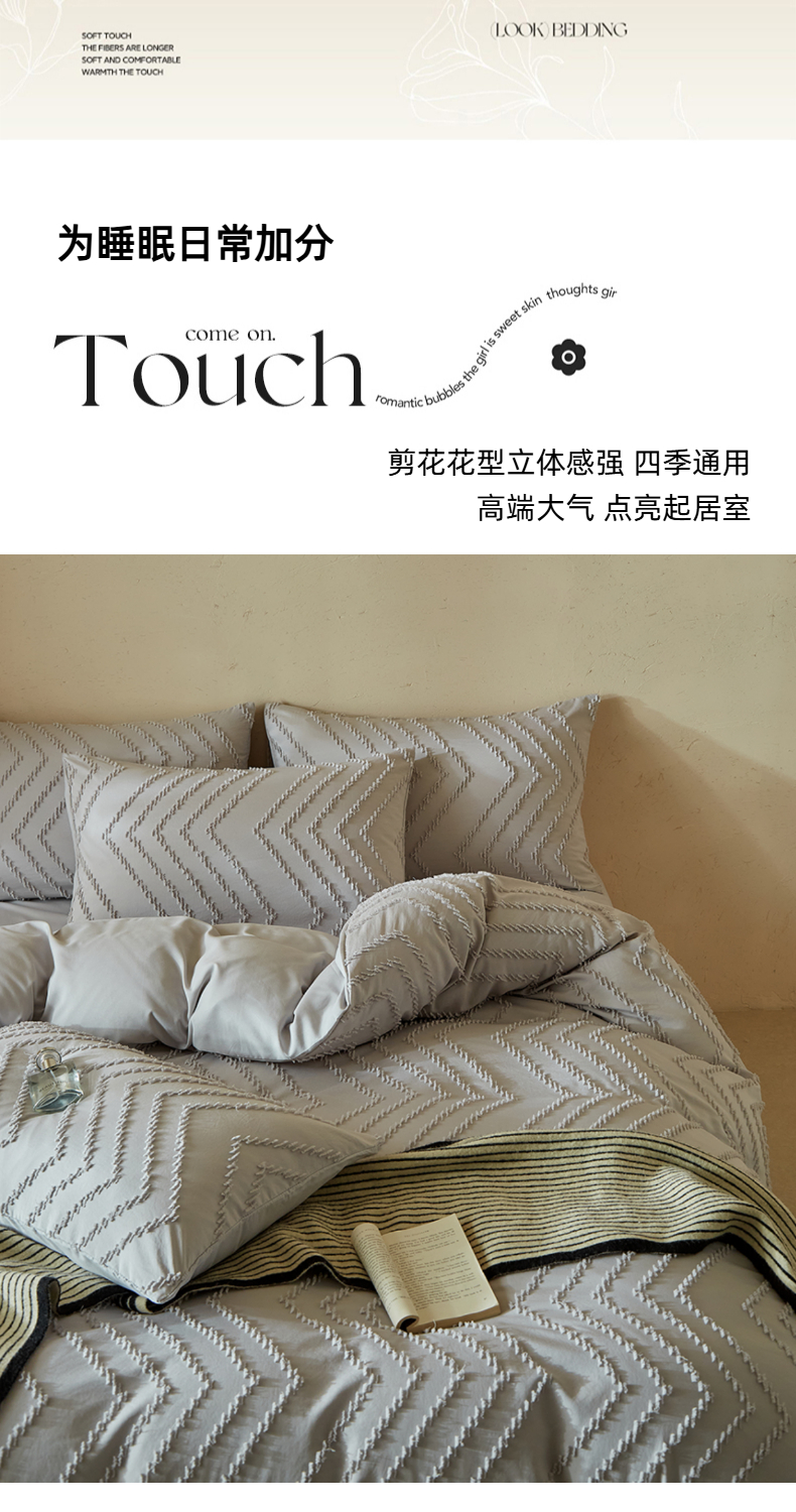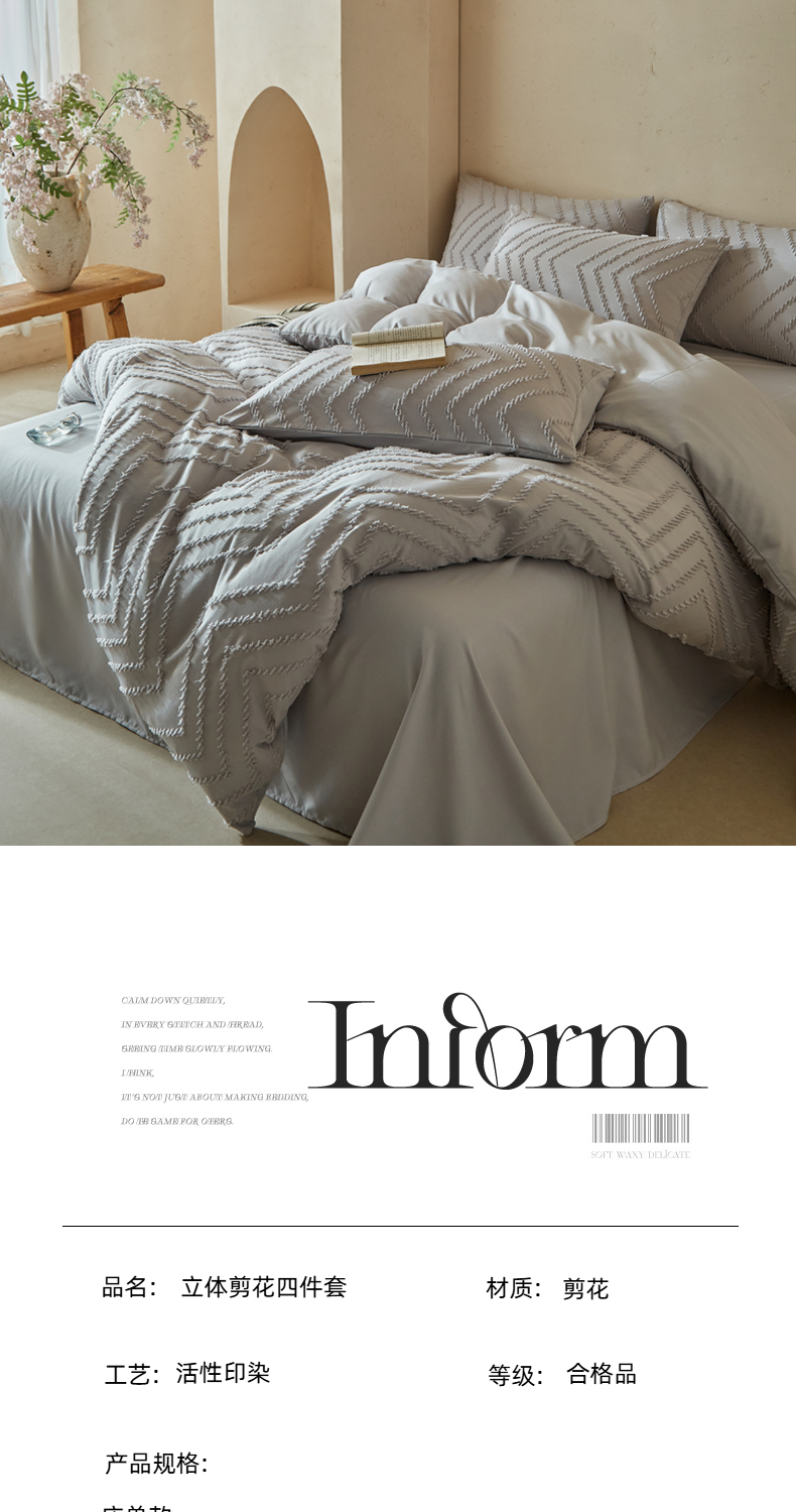 当前位置: 91家纺网 > 商品网购 > 床品套件 > 四件套 > 其它四件套 > 缘生活 2025新款立体剪花A面剪花面料B面加厚磨毛布料四件套 剪花波浪-浅灰