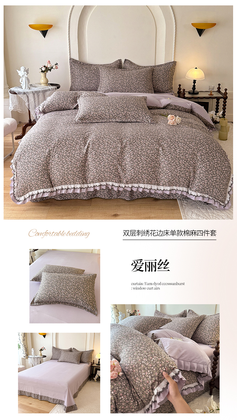 韩约家纺 2025秋冬加厚1双层刺绣花边床单款棉麻四件套 千寻