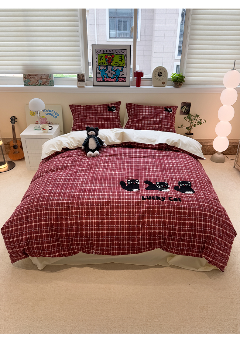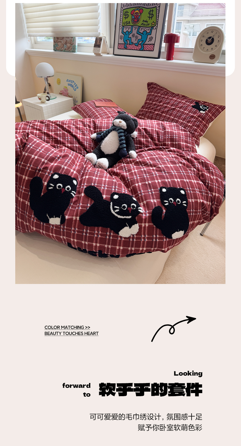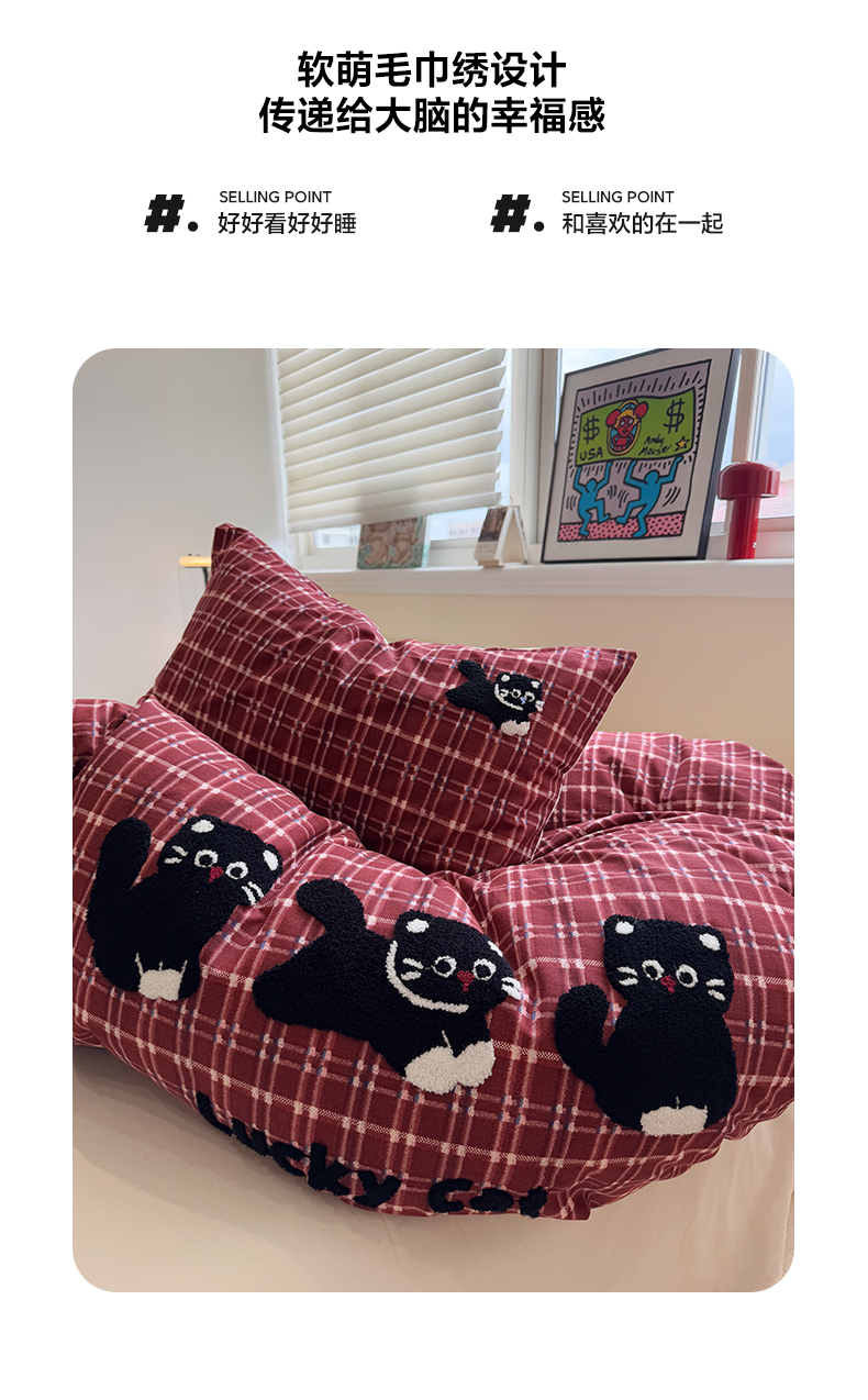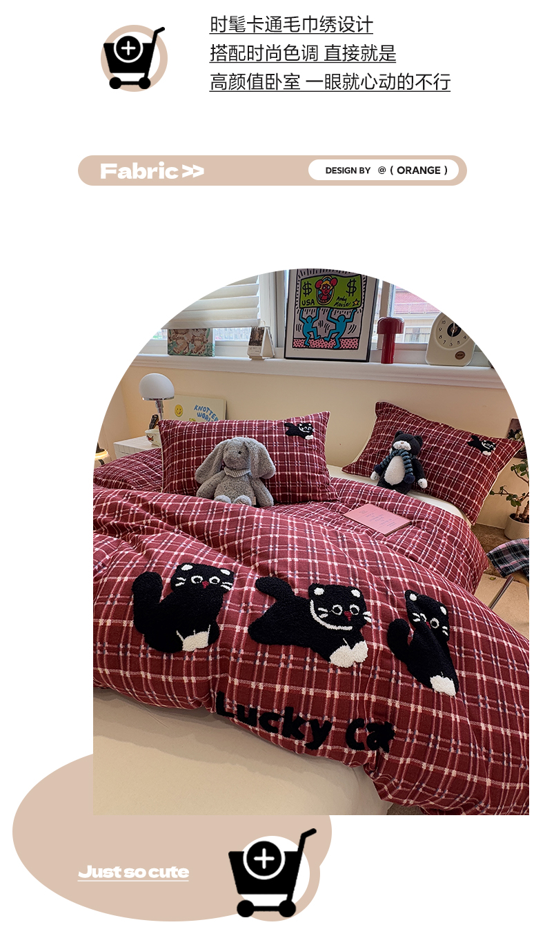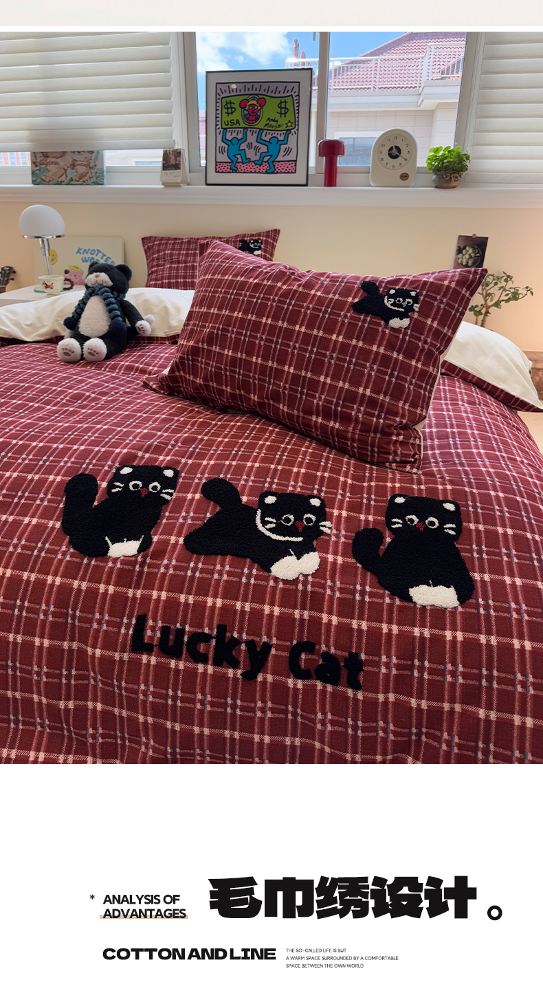 当前位置: 91家纺网 > 商品网购 > 床品套件 > 四件套 > 全棉普通四件套 > 雅居纺家纺 2025新款全棉纯棉磨毛毛巾绣四件套 红格幸运猫