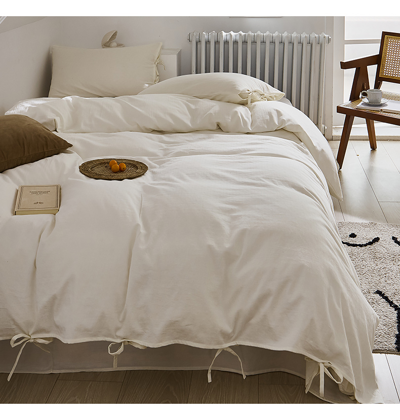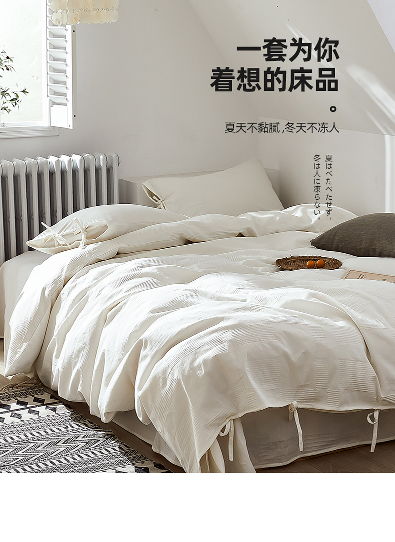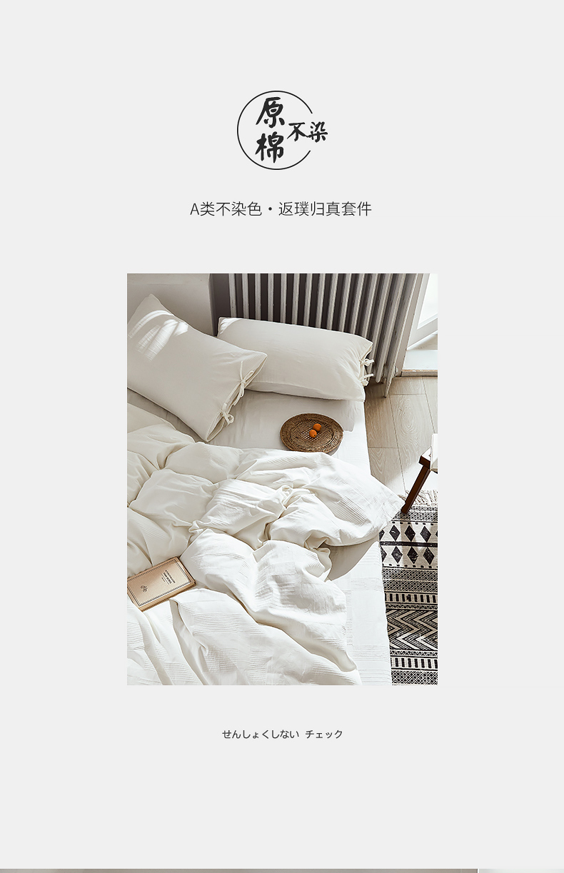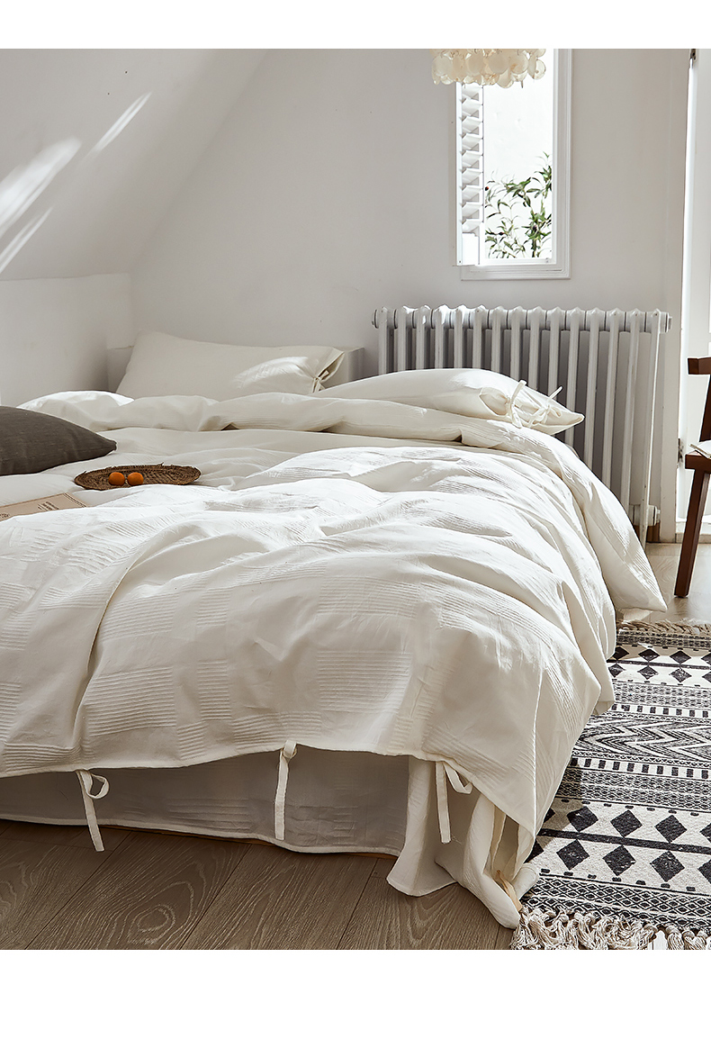 当前位置: 91家纺网 > 商品网购 > 床品套件 > 四件套 > 全棉普通四件套 > 贝尔 PELLHOME不染A类婴幼儿天然全棉提花大方格纯白素色日式绑带式四件套 可抖音代发 大方格