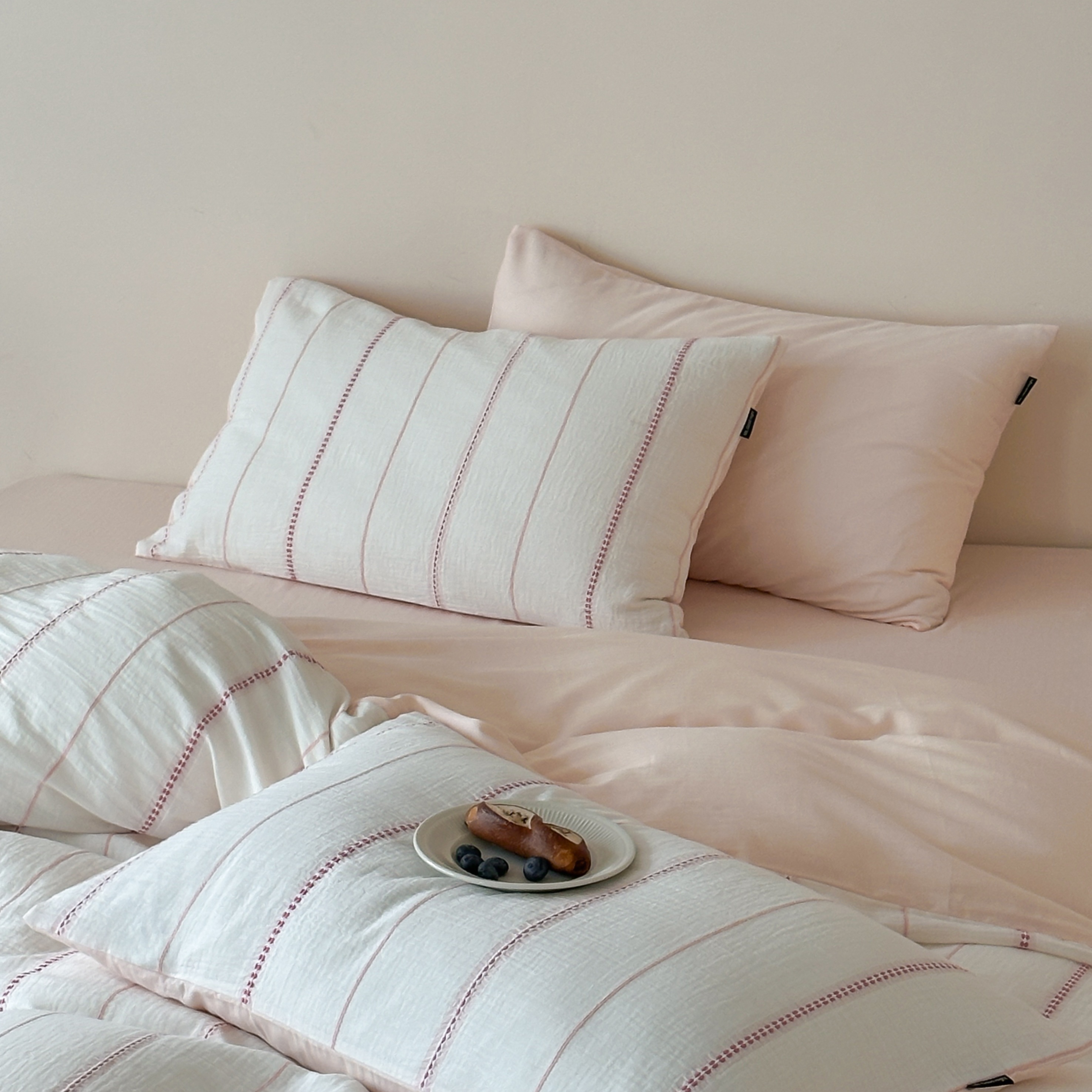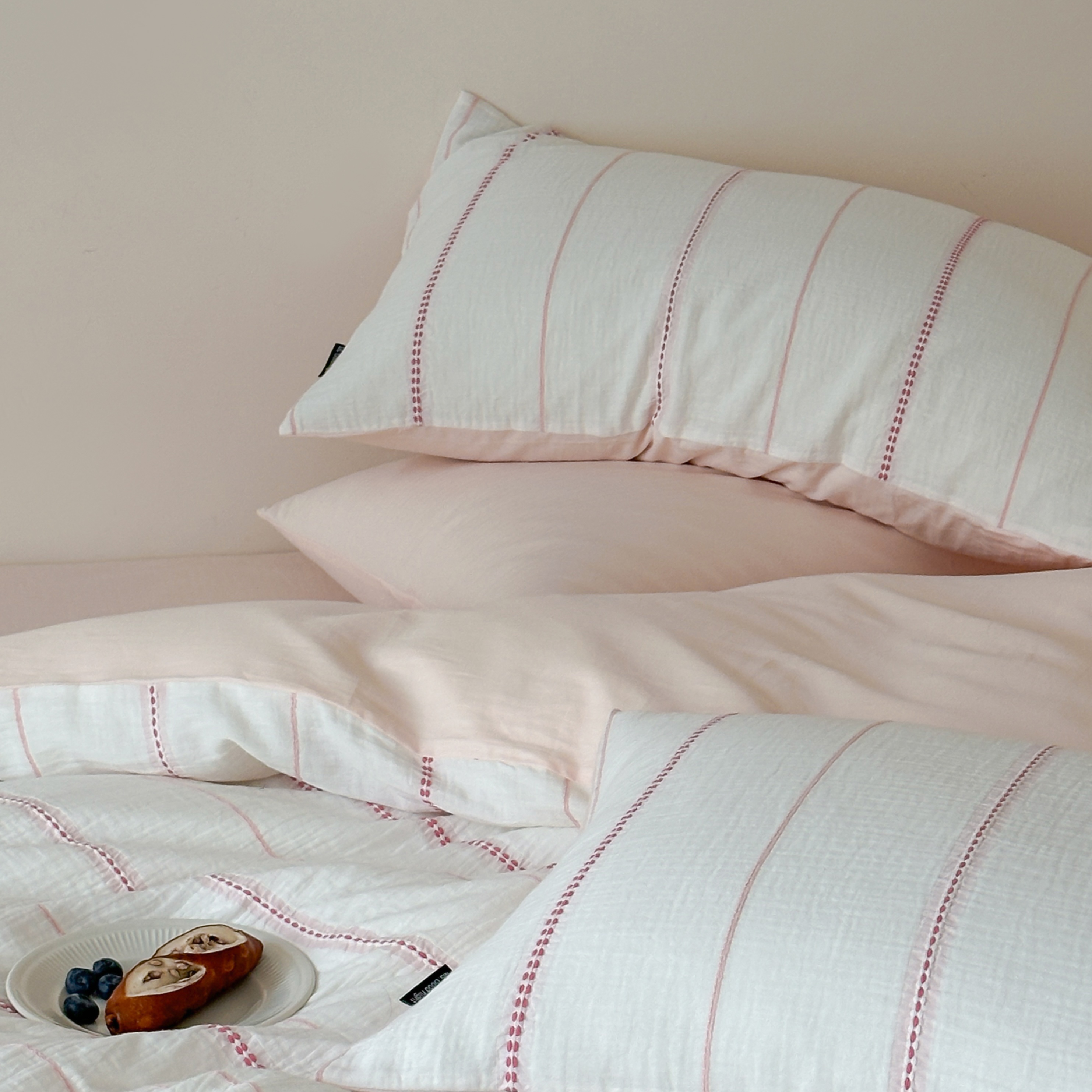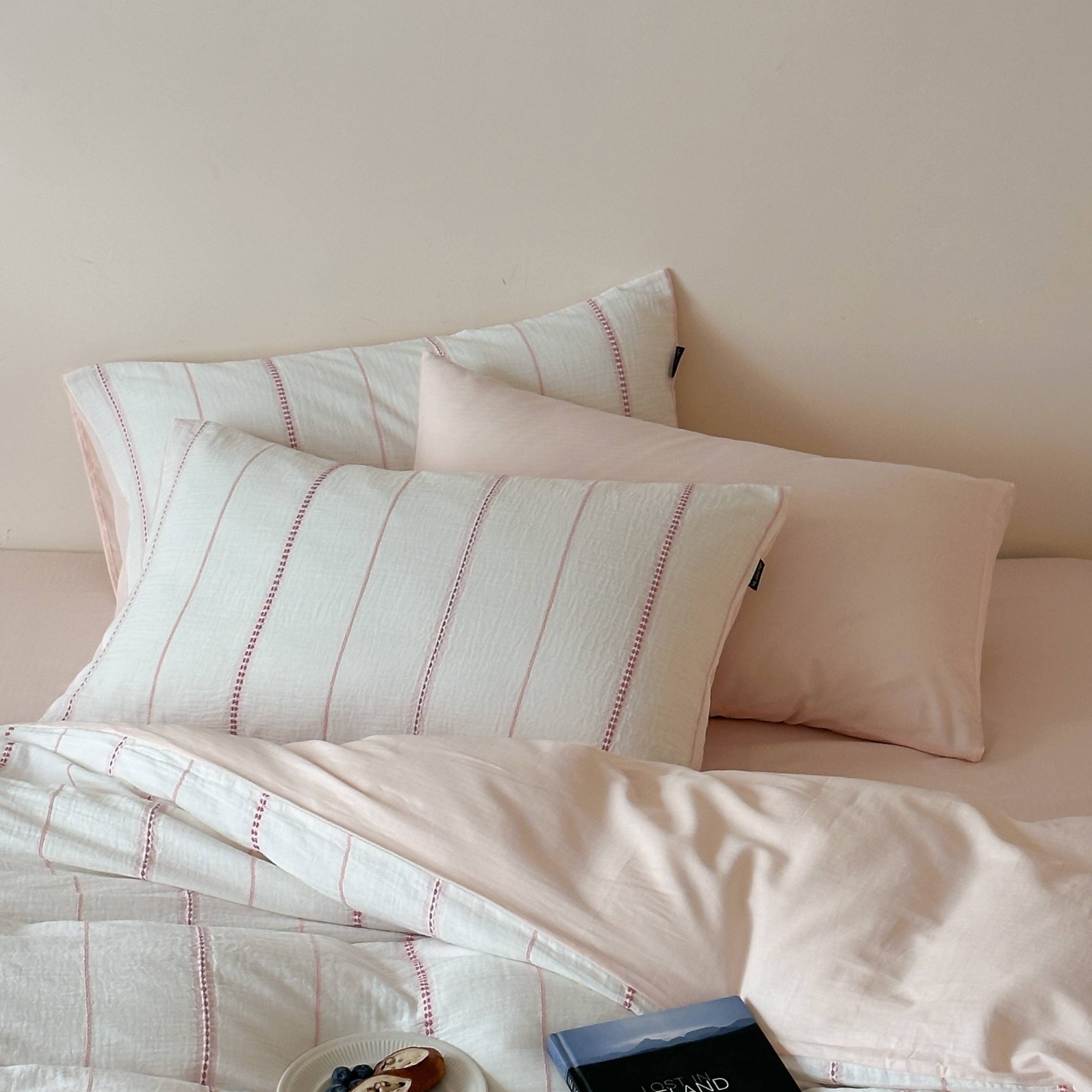 当前位置: 91家纺网 > 商品网购 > 床品套件 > 四件套 > 全棉普通四件套 > 蜜宿 2025新款全棉纯棉水洗双层纱穿线提花四件套 梨白-粉