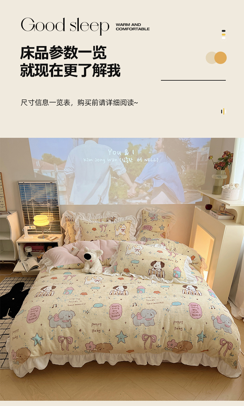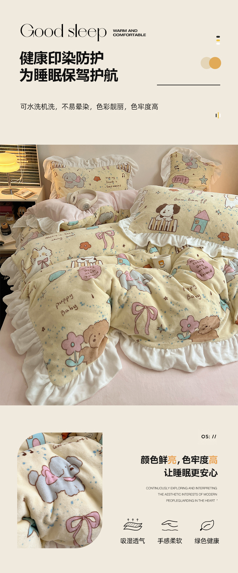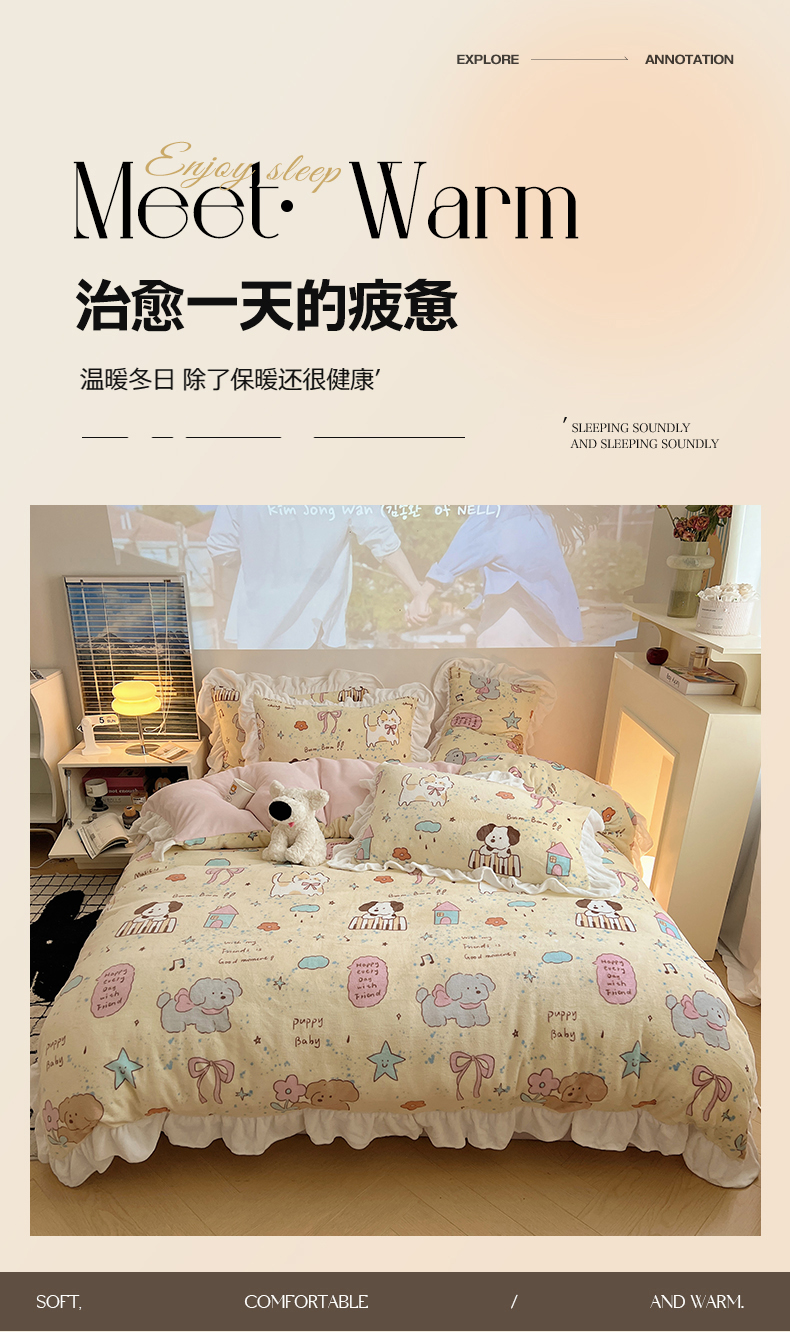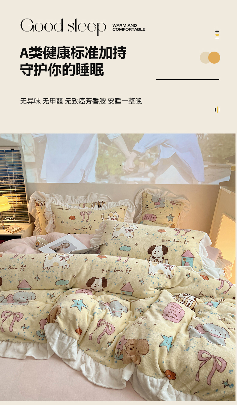 当前位置: 91家纺网 > 商品网购 > 床品套件 > 四件套 > 牛奶绒四件套 > 六巷胡同 2025新款韩版INS卡通花边款A类牛奶绒四件套 花边动物聚会趴