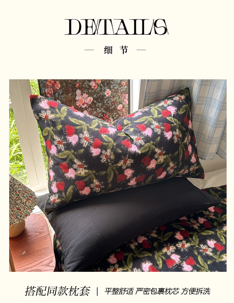 商品名称:花伞家居 2025新款小众高级感纯色花卉拼色加厚水洗棉四件套【提供买家秀】 椿屿-黑