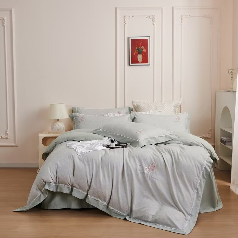 总玖玖爱家纺 纯棉100支贡缎长绒棉刺绣被套三件套四件套加大四件套,白色,高级灰,卡其,蓝灰,绿色,浅桔,深蓝,紫豆沙