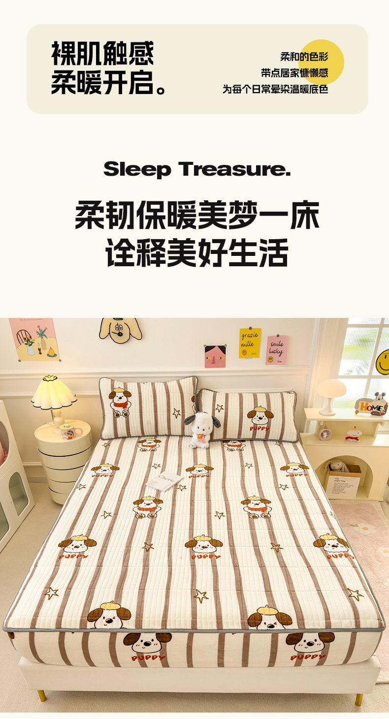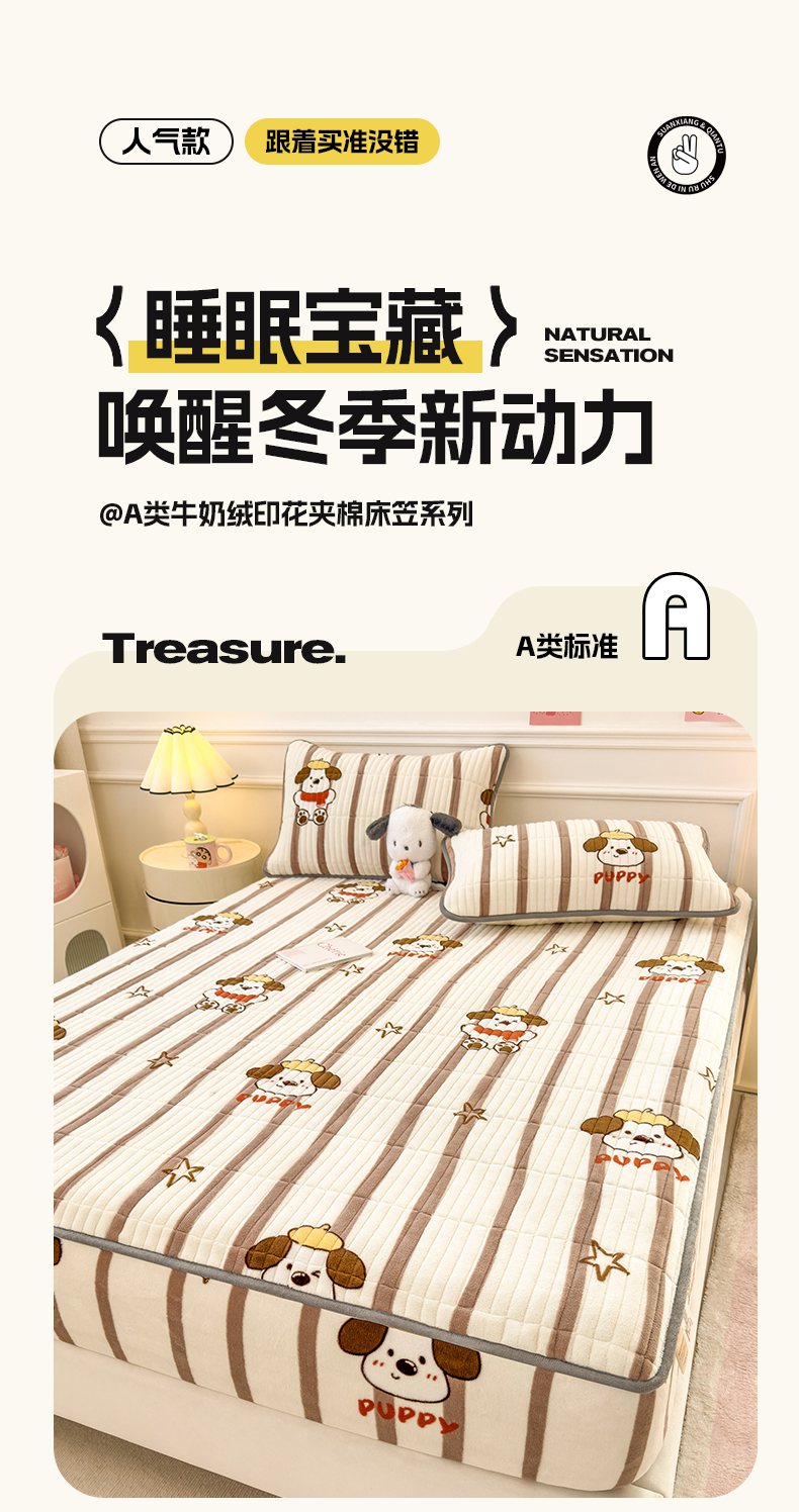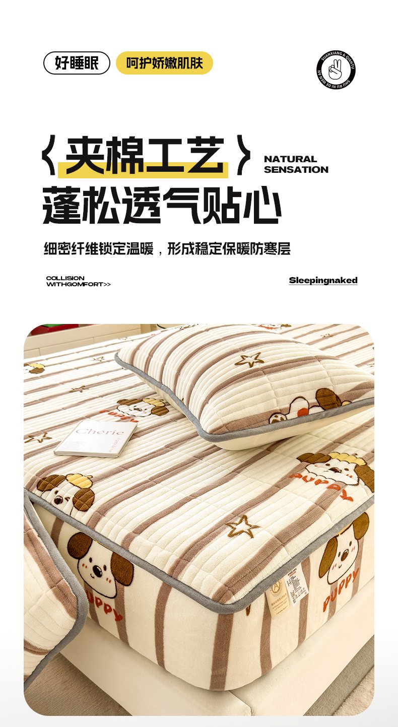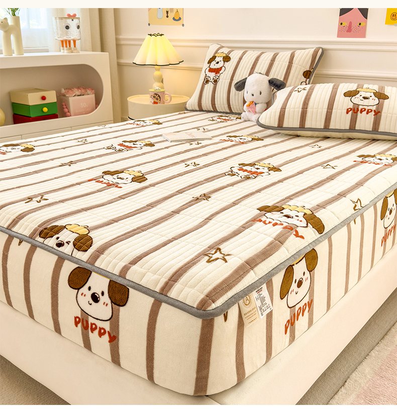 • 91家纺网 家纺一手货源 找家纺 摩妮卡 2025新款小清新系列印花牛奶绒夹棉床笠三件套 嘟嘟狗