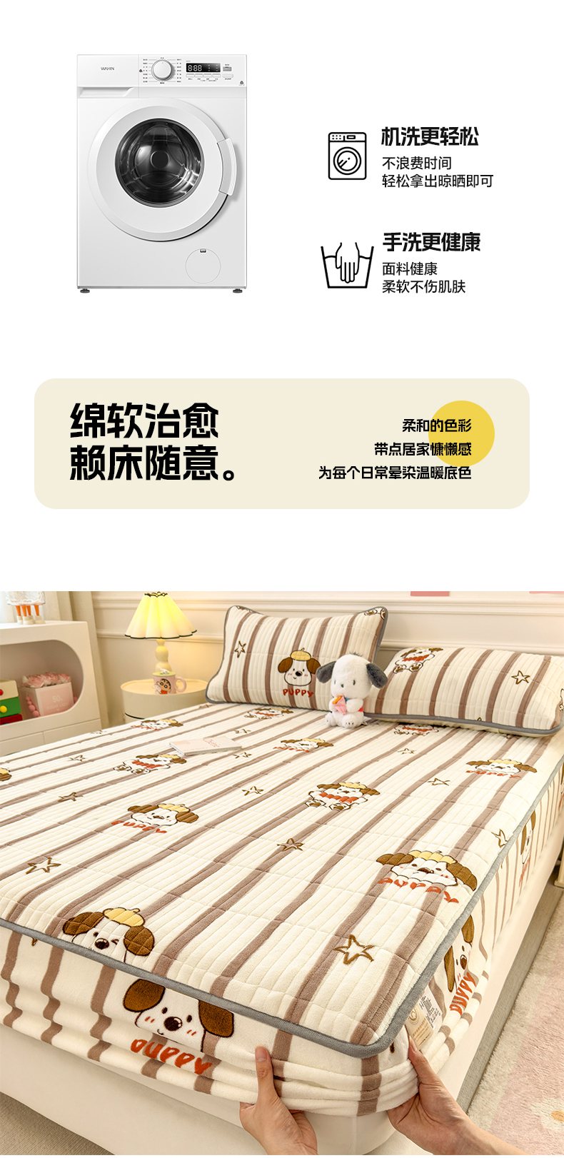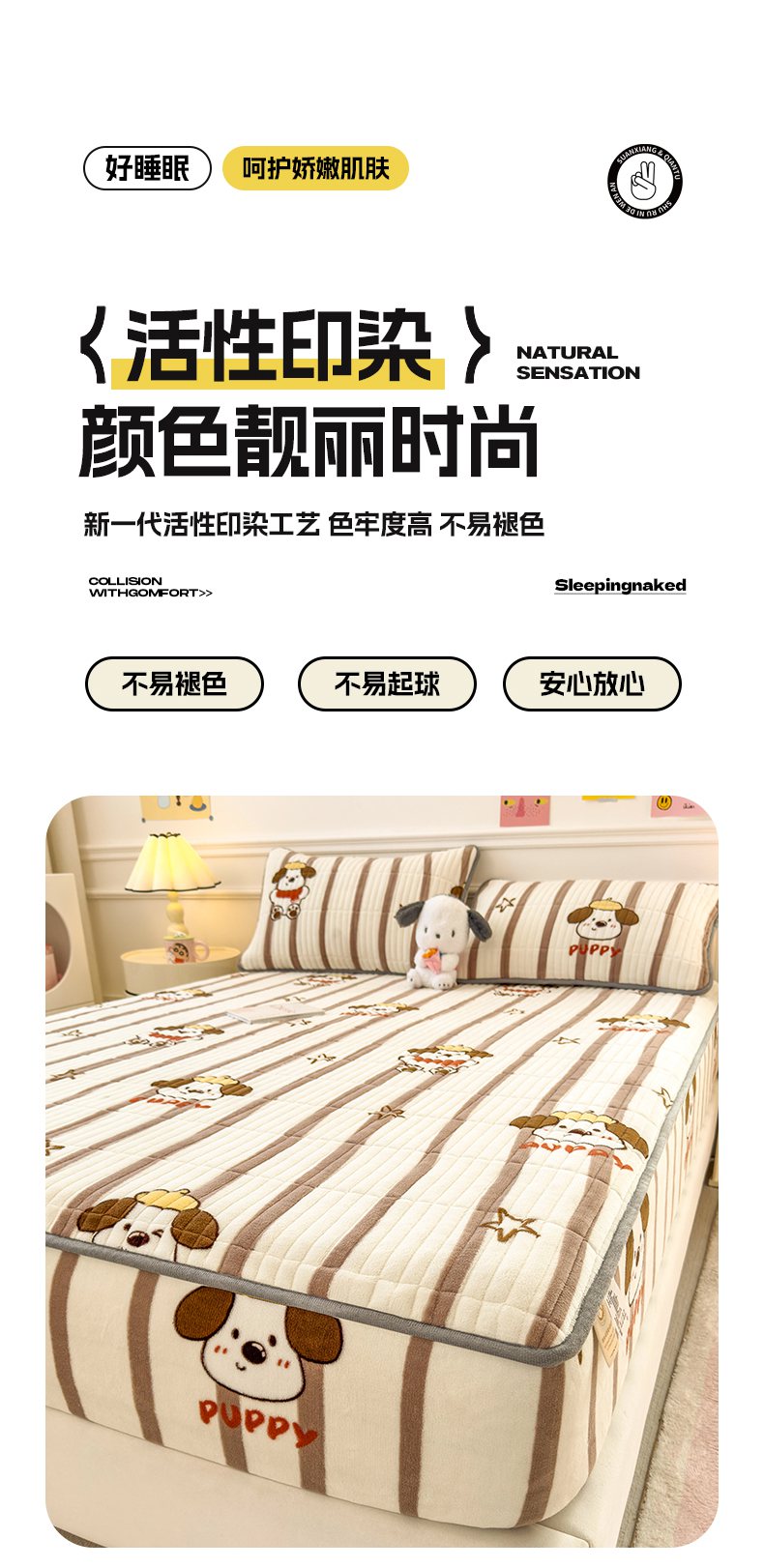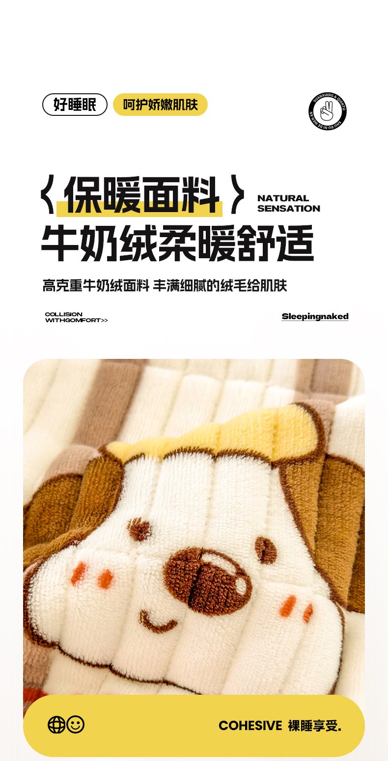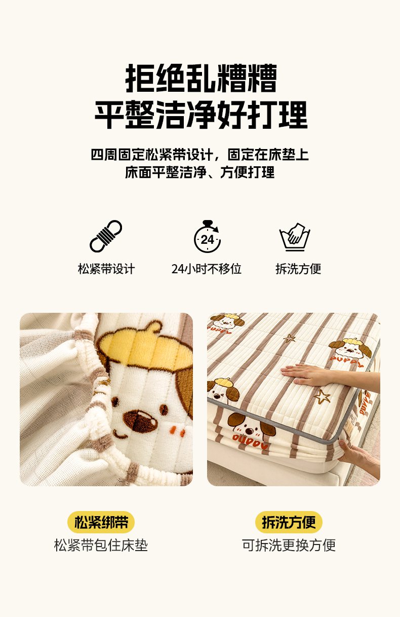 • 91家纺网 家纺一手货源 找家纺 摩妮卡 2025新款小清新系列印花牛奶绒夹棉床笠三件套 嘟嘟狗